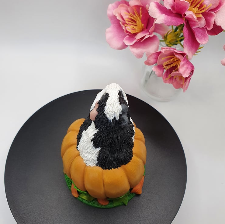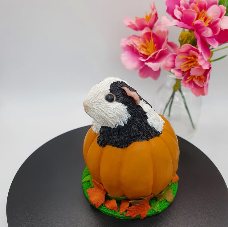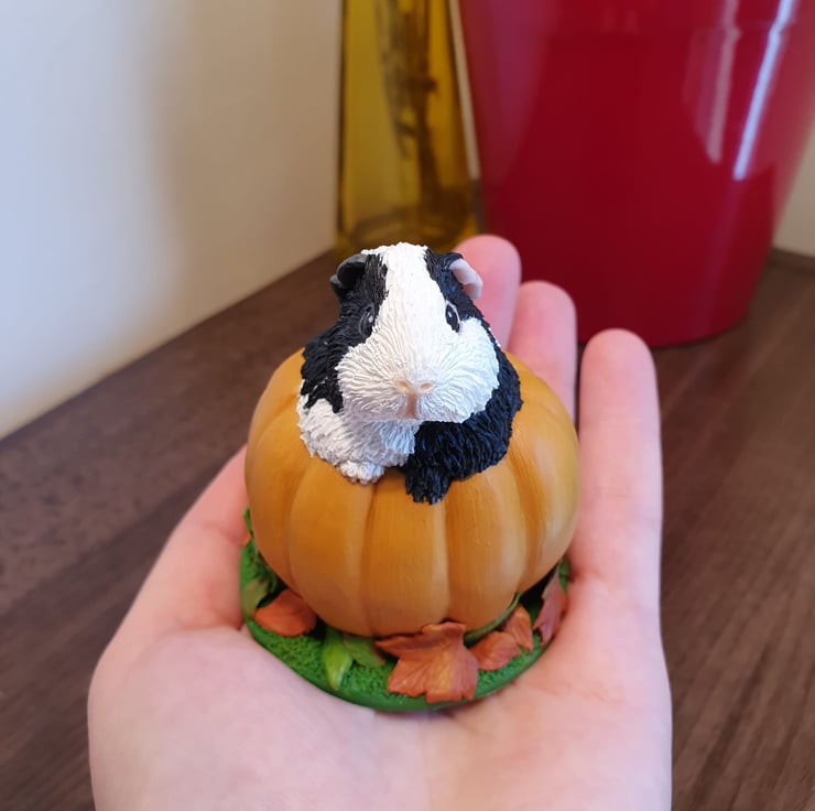 Autumn inspired figurine of a guinea pig sitting inside a pumpkin. Guinea pigs are very good at fitting in many spaces and they are always very hungry, so it wouldn’t be too much of a surprise to find them carving their way through ;)