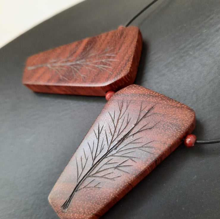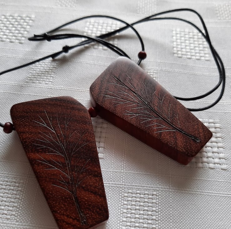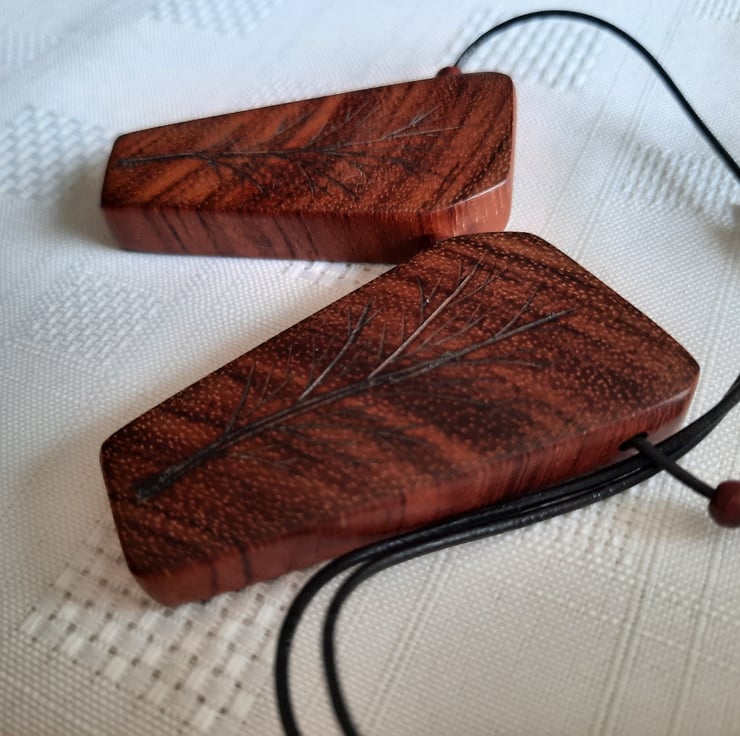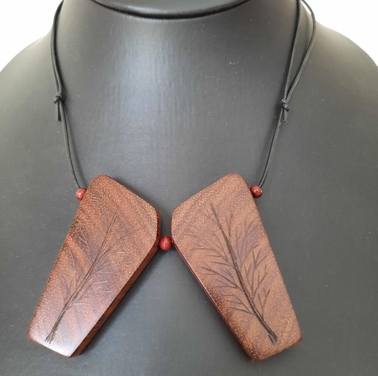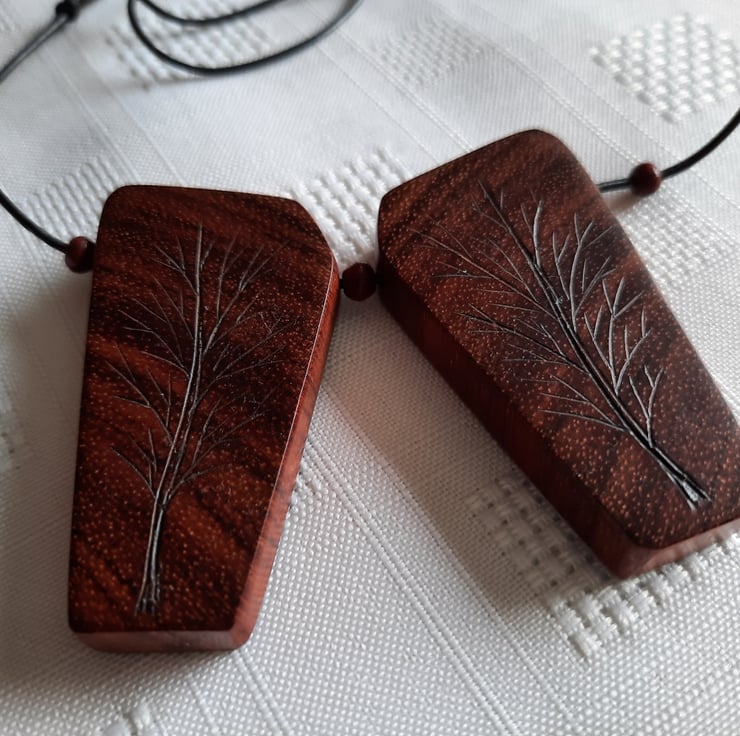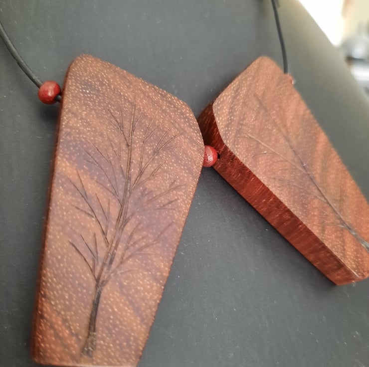A wooden pendant made using 2 pieces of unknown dark wood measuring approx. 5.2cm x 3cm. Each piece of wood has a tree deisgn which is burnt on using a pyrography pen. Between each piece of wood are small round coconut beads. The pendant is strung on a length of black leather cord with sliding knots so the length can be adjusted. This item comes in an organza bag. There is an option to have the necklace gift boxed at checkout.