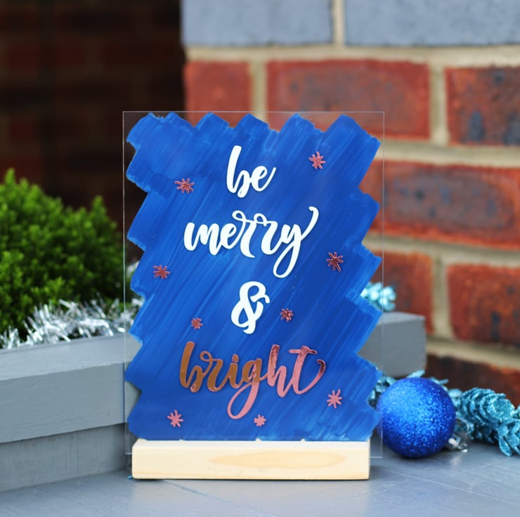 'be merry & bright' Acrylic Christmas sign with handprinted background and precision cut lettering.