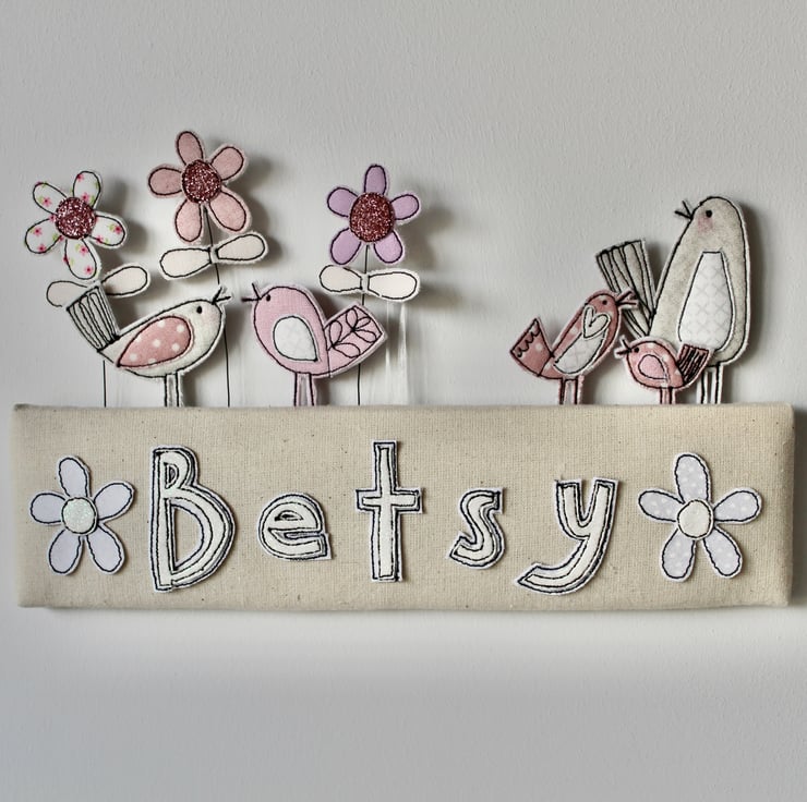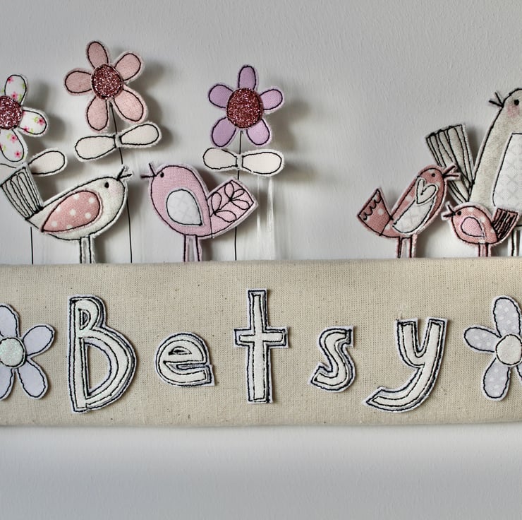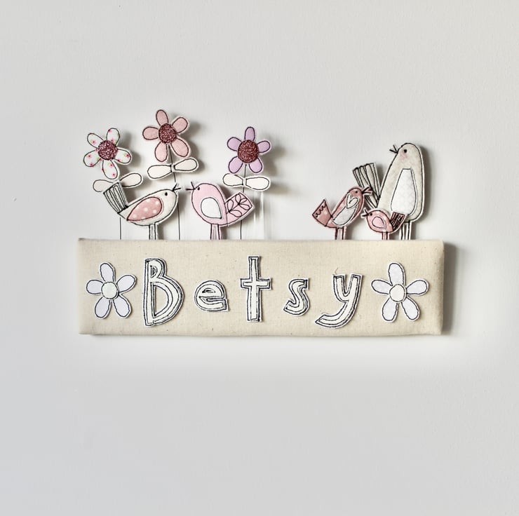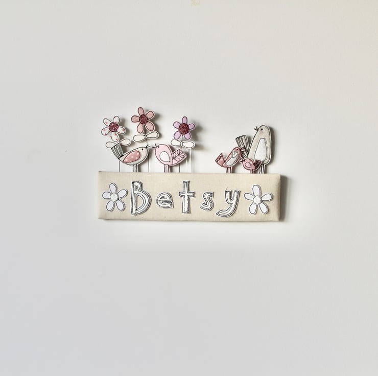 A padded cream coloured door plaque, proudly displays your chosen name with five birds and five flowers.