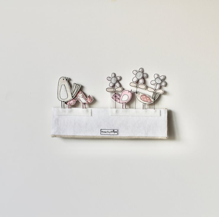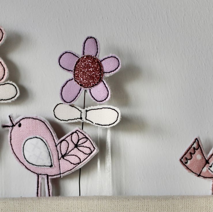 The letters, birds and flowers are sewn using multiple layers of cloth, free hand machine embroidery and cut out by hand using very sharp scissors.