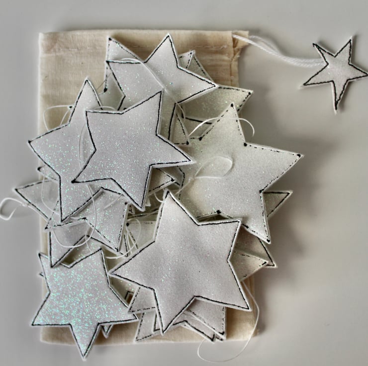 Measuring approximately 145cm in length, with the stars measuring approximately 6cm and 5cm across. Your garland will be sent in a calico drawstring bag with a little glitter star and wrapped in a spotty paper bag.
