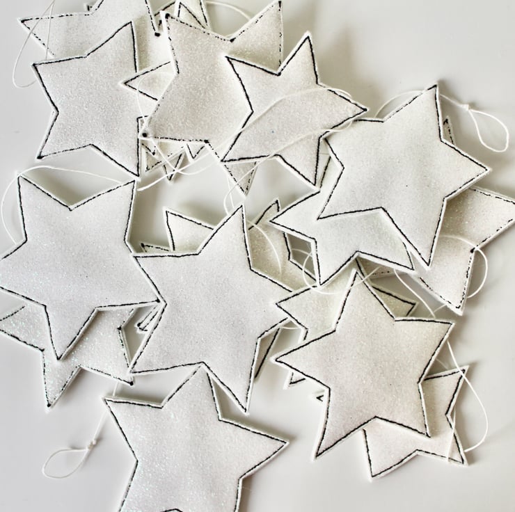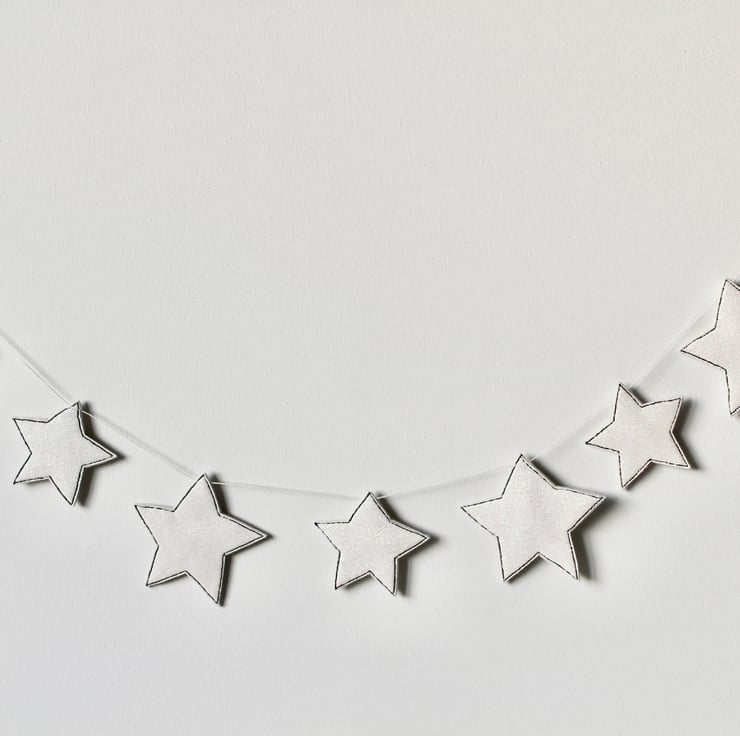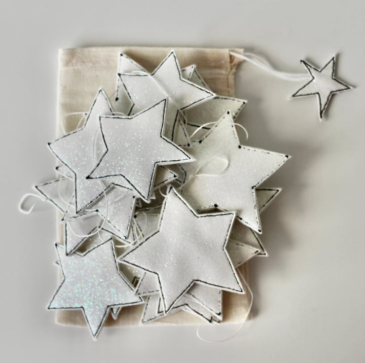 Each of the nineteen stars suspended along this garland, is sewn using a combination of glitter fabric, 100% wool felt and free hand machine embroidery; multiple layers of cloth are sewn together and cut out by hand using very sharp scissors.