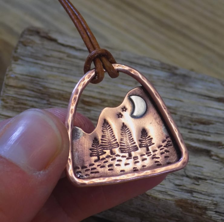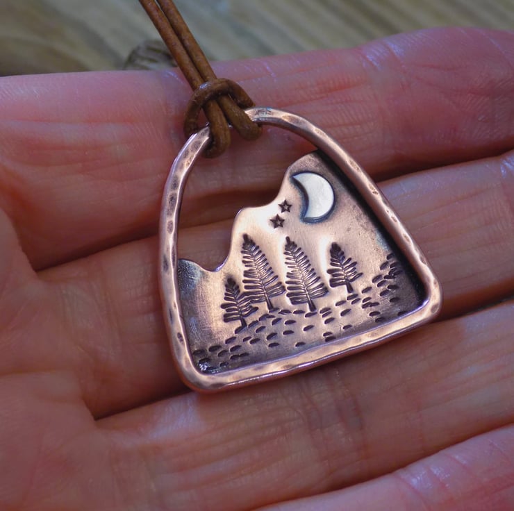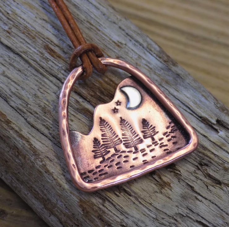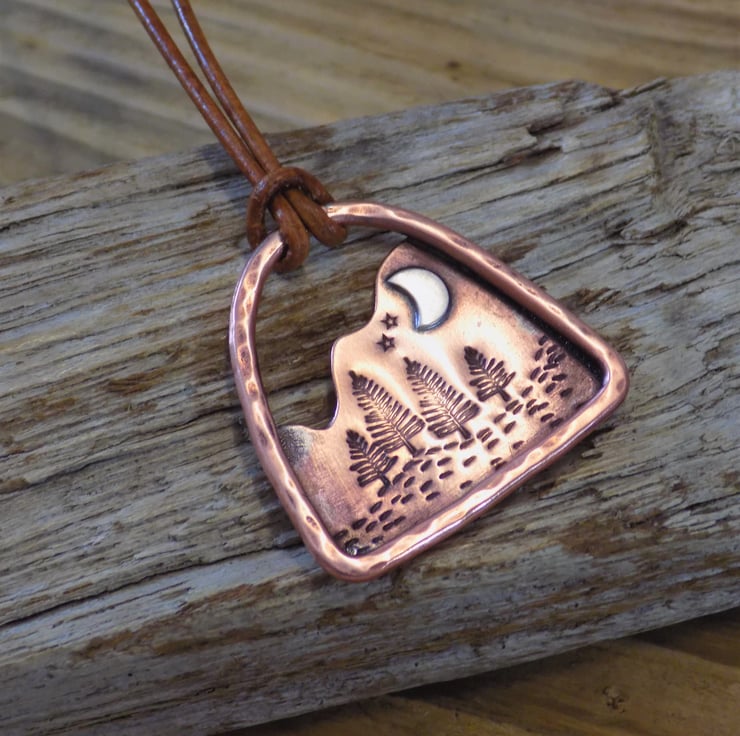 Made from copper wire, sheet and sterling silver sheet. The edge of the pendant has been formed from thick copper wire, textured and then soldered to a copper backing . A group of fur trees have been stamped onto it , some stars and a sterling silver moon has been soldered on to set the scene. Hangs from mid brown vintage leather cord measuring from 18" - 20"