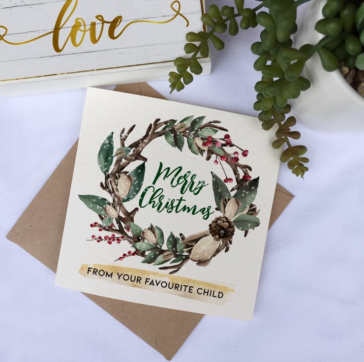Personalised funny Merry CHRISTMAS card with green foliage wreath, red berries, pine cones, deer antlers