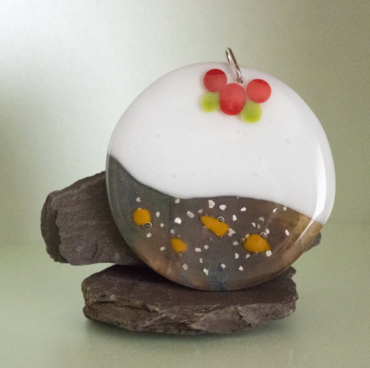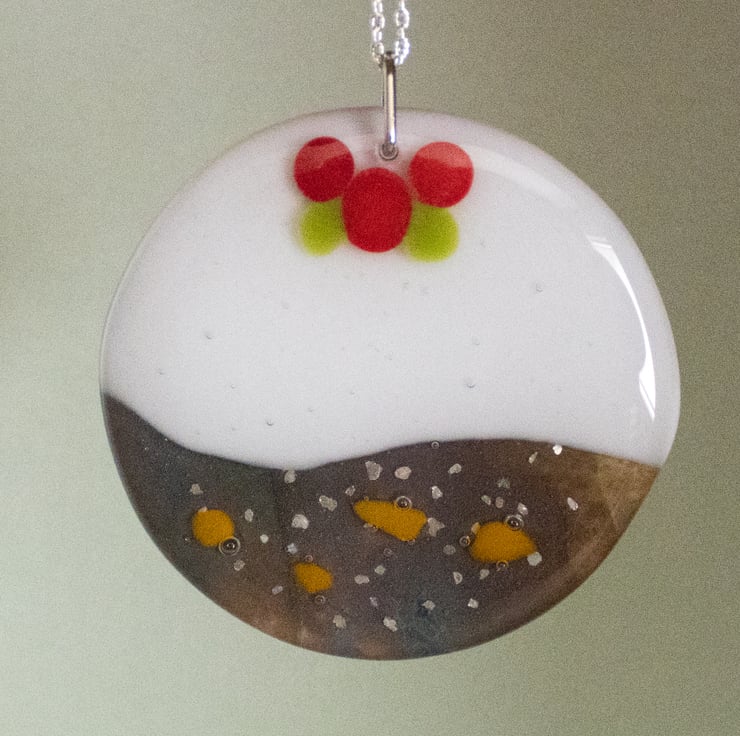 Each circular pudding is constructed from 3 layers of hand-cut glass, mica flakes and pre-prepared coloured glass dots. All the pieces are assembled in the kiln and fused to around 800c which fuses them all together. Once cooled a hole is drilled and the whole piece is strung from a stainless steel chain.