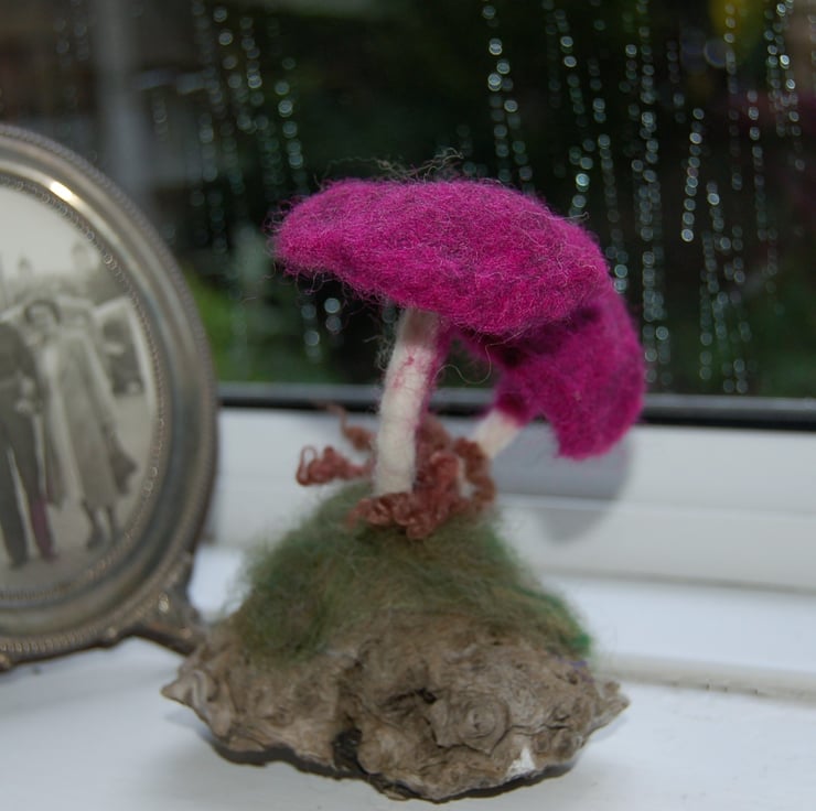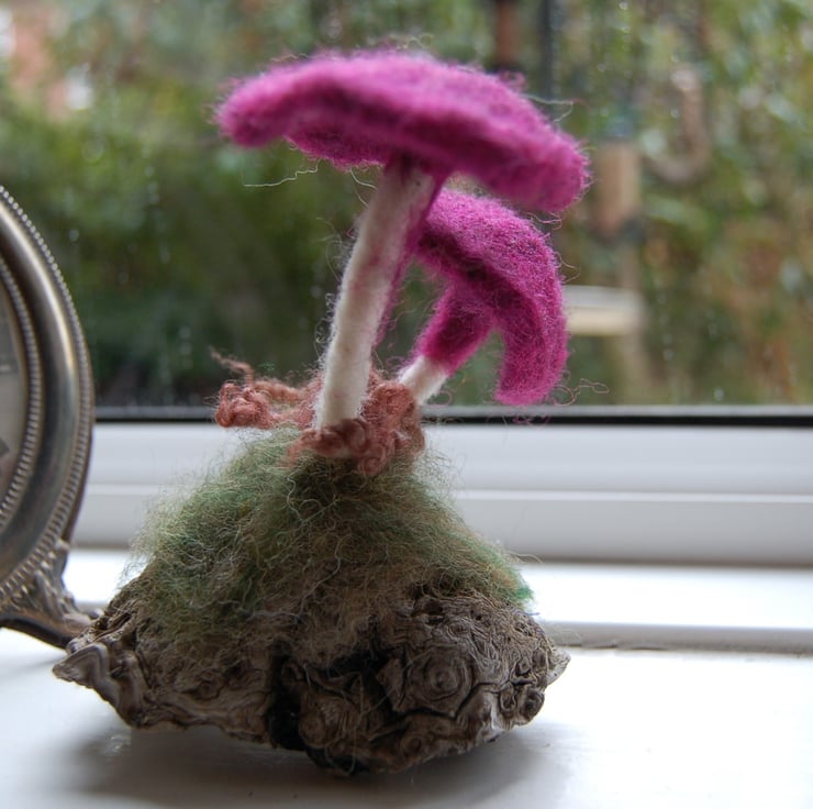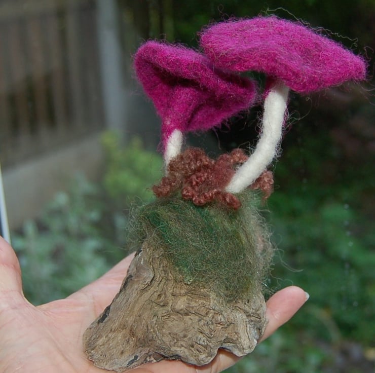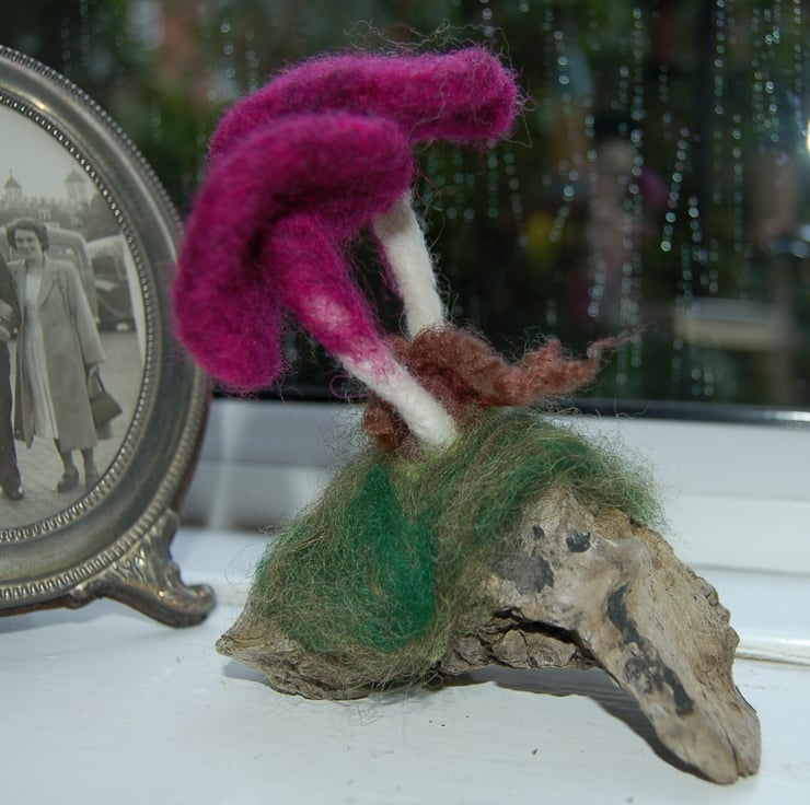 The mushrooms have been made from purple and white wool fibres jabbed into shape and attached to a lovely piece of driftwood.. Blended shades of green wool fibres sit around the base of the mushroom, a wool curl represents fern.
