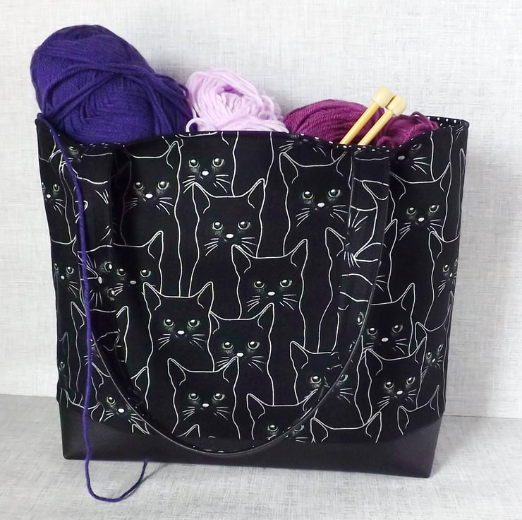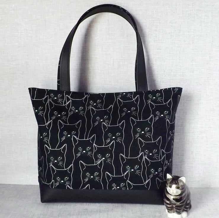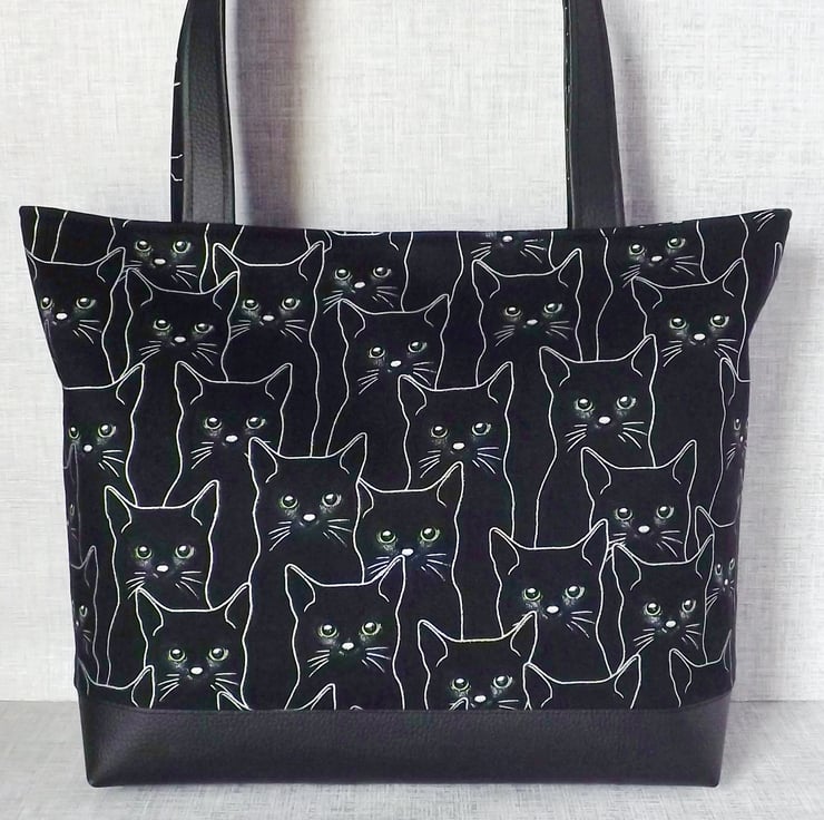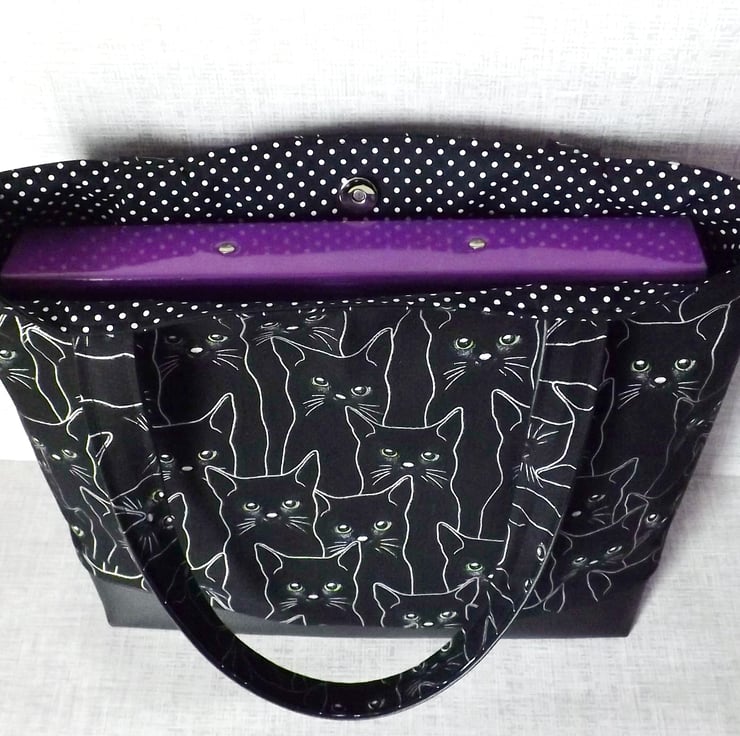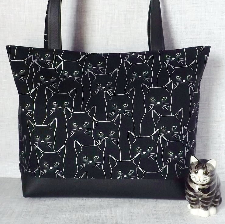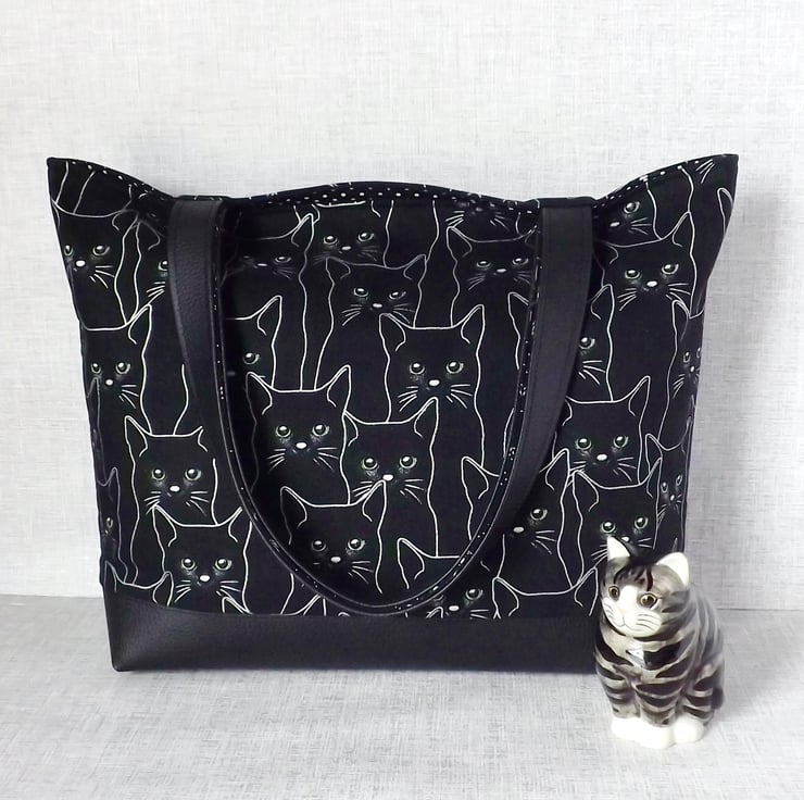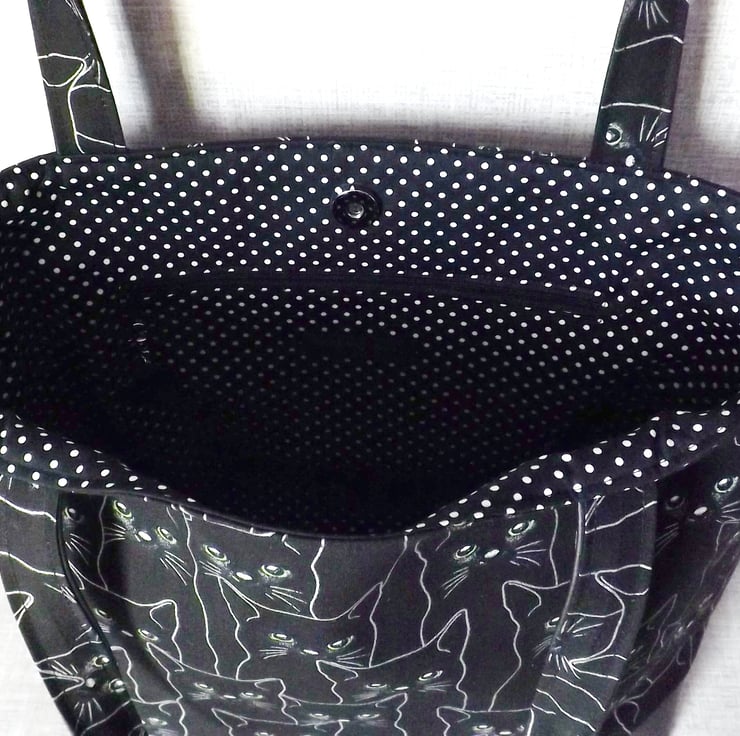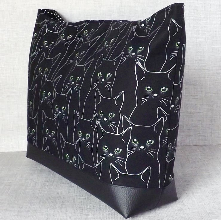 The main fabric is black with an all over print of black cats, outlined in metallic silver colour with green highlights for the eyes. The lining is a black and white spotty cotton fabric.