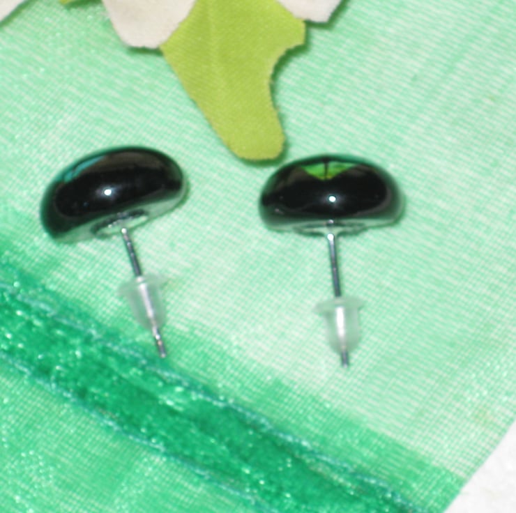 Pair of golden brown/light green dichroic with wavy line pattern (on black) 11mm round stud earrings.