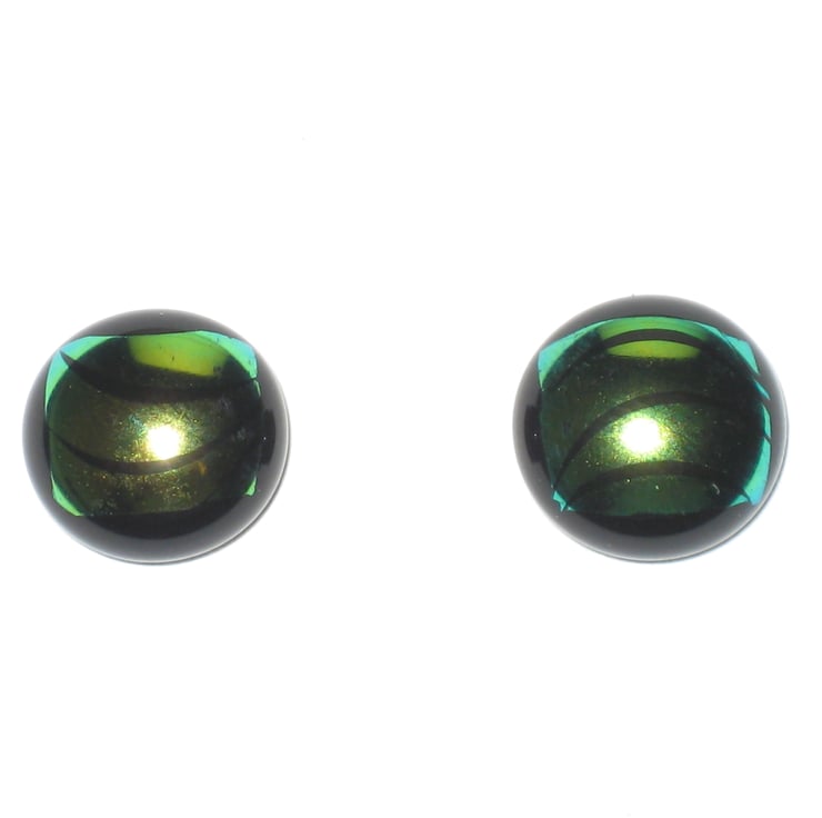 Pair of golden brown/light green dichroic with wavy line pattern (on black) 11mm round stud earrings.