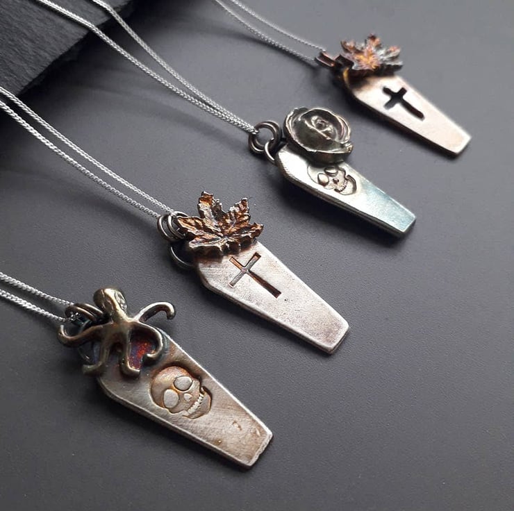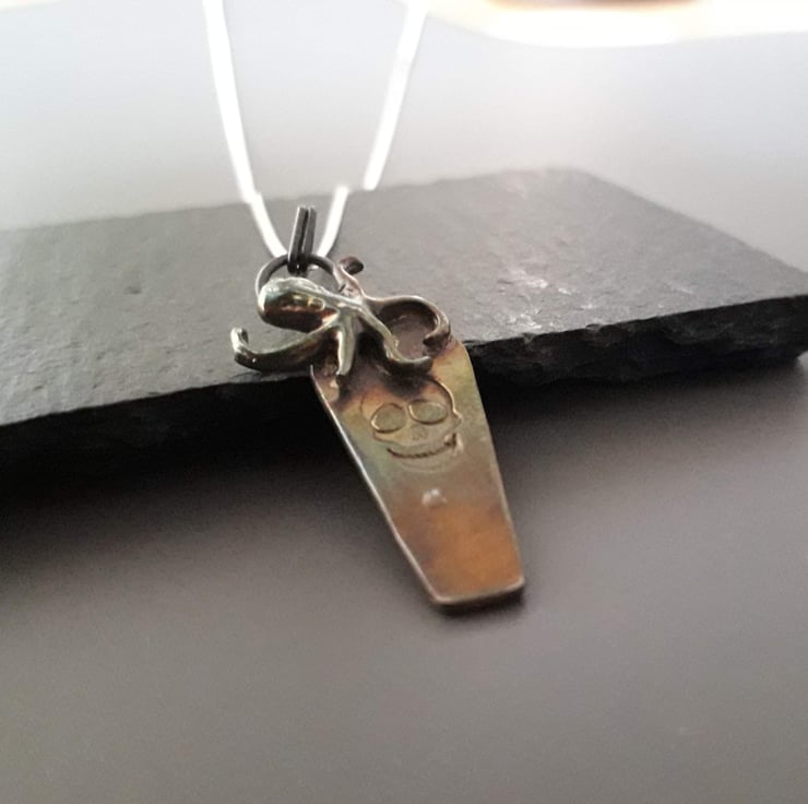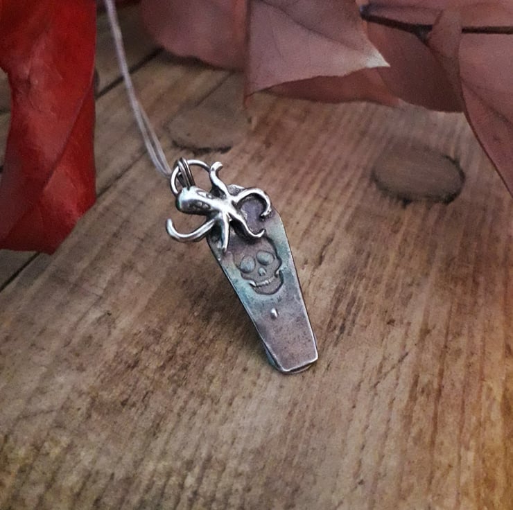 I made this coffin and octopus pendant as part of my coffin keeper series. Entirely handcrafted with fine silver and oxidized to get these dark and unusual colours that change depending how the light hits. The gravity of the pendant is somewhere between the octopus and the coffin, so it will never hang fully straight. More quirky points for that! :) It is about 1 inch long and comes with an 18 inch long silver chain.