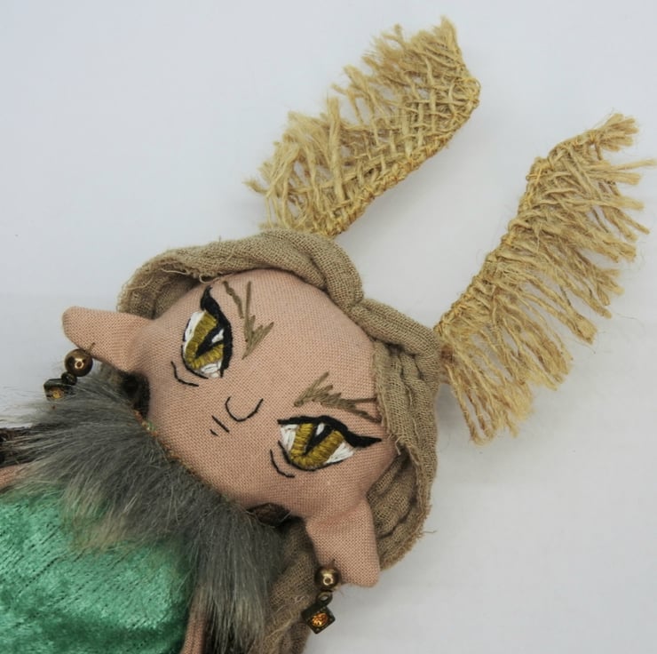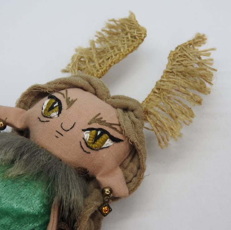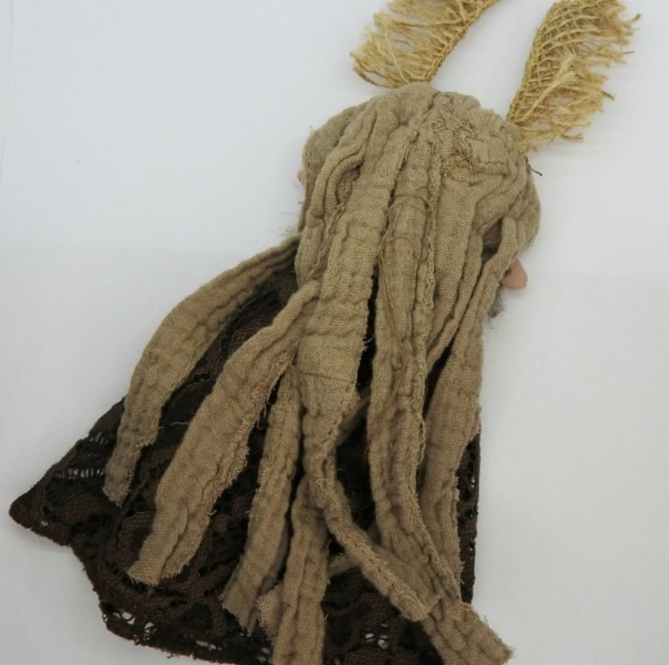 Ddaear the growth sprite is adorned with upcycled materials including cotton hair, velvet dress hand sewn into place and hessian antlers. Ddaear wears an upcycled lace Cape and her earings are made from pre loved beads. Ddaear is an ancient, powerful sprite who embodies the resilience of nature. Ddaear measures roughly 20cm tall and comes with your choice of hanging attachment pictured last. The metal attachment is best for wall hanging. This doll is for decorative purposes only and not a toy