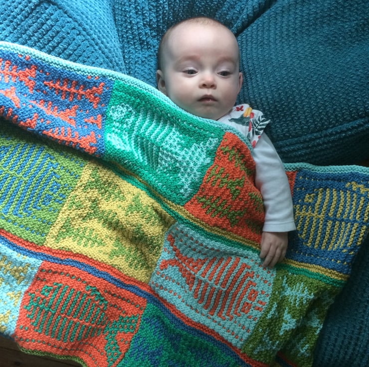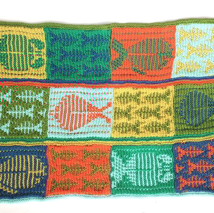 “Fishes” usually refers to multiple species of fish, especially in scientific contexts. Relevant for this beautiful knitted “Fishes” bath mat / baby blanket created from 12 fish rectangles worked in mosaic slip stitch in 2 bright coloured cotton yarns.