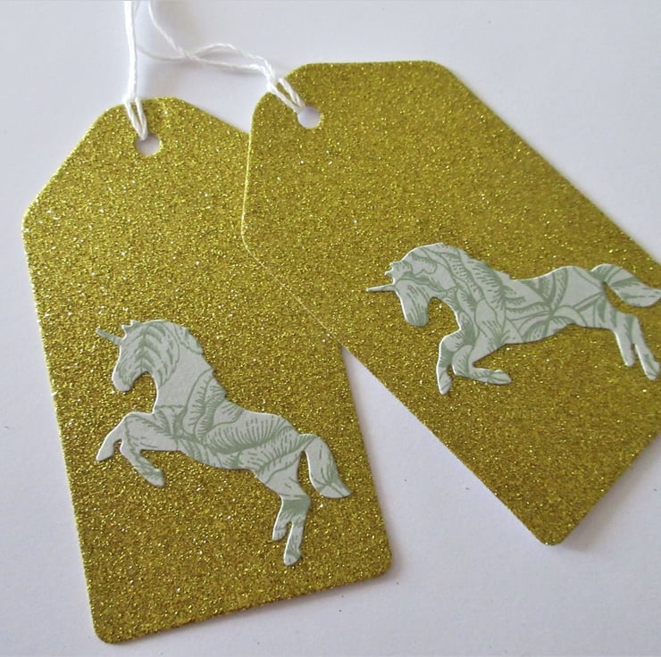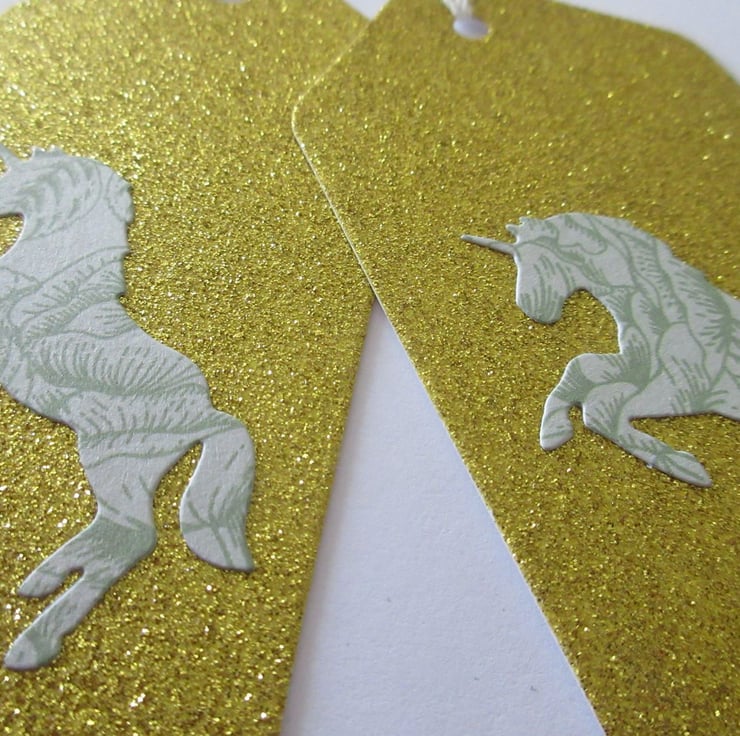 A pair (2) of hand crafted gift tags featuring die cut unicorns.