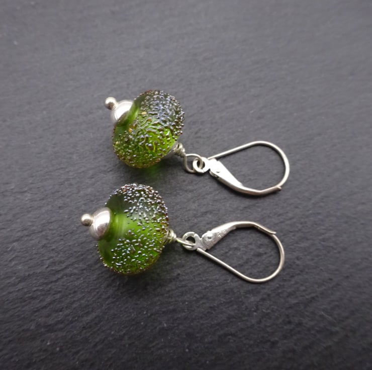 A pair of sterling silver lever back earrings featuring sterling silver beads and handmade lampwork green glass beads which have been decorated with silver sparkles.