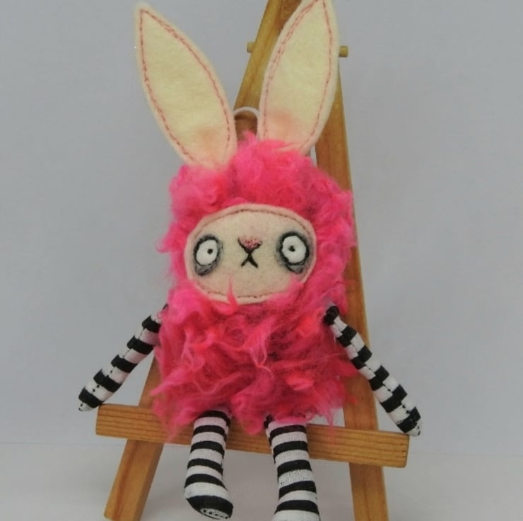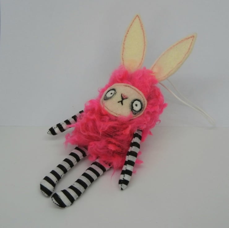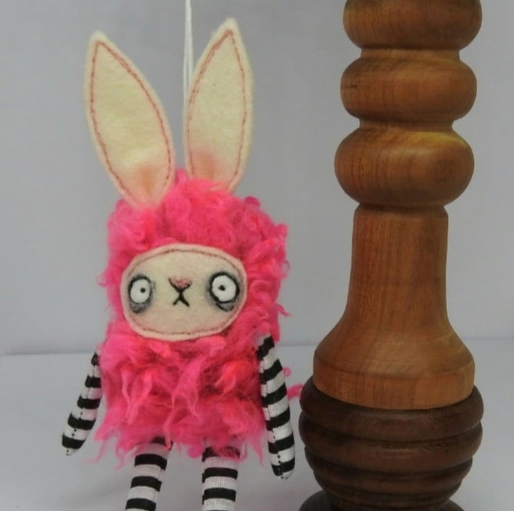 Fuzzy bunny with cotton arms and legs, faux fur body and felt face and ears. Face is free motion embroidered and ears are hand sewn into place. Comes with wax thread hanger attached and measures between 14-15cm. Sent in recyclable packaging. This is meant for decorative purposes and is not a toy. This listing is for 1 bunny, shown in the main image.