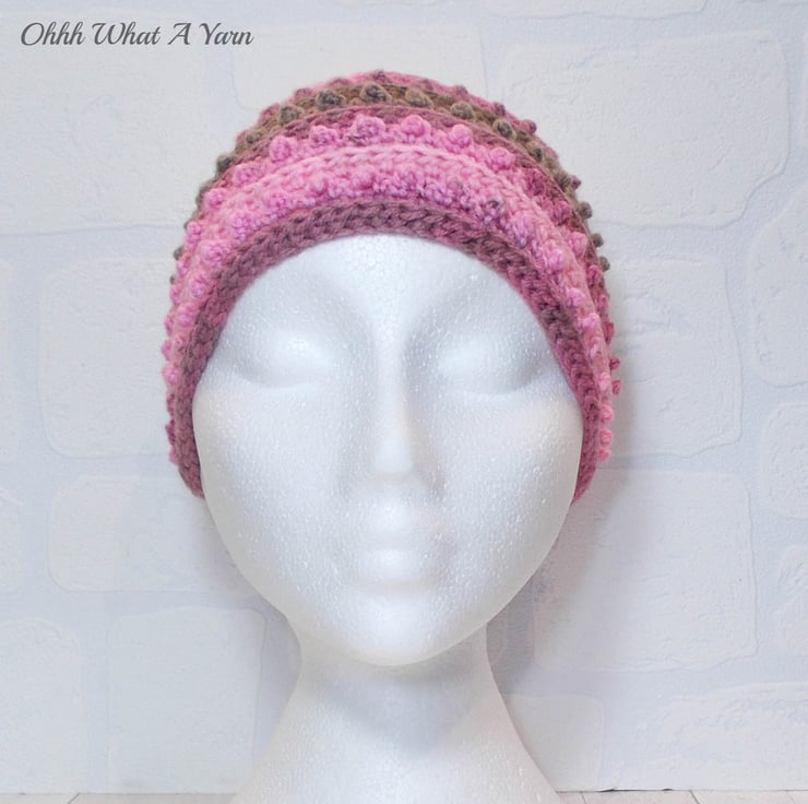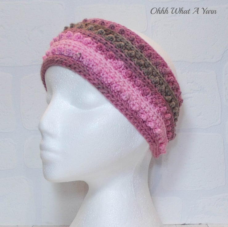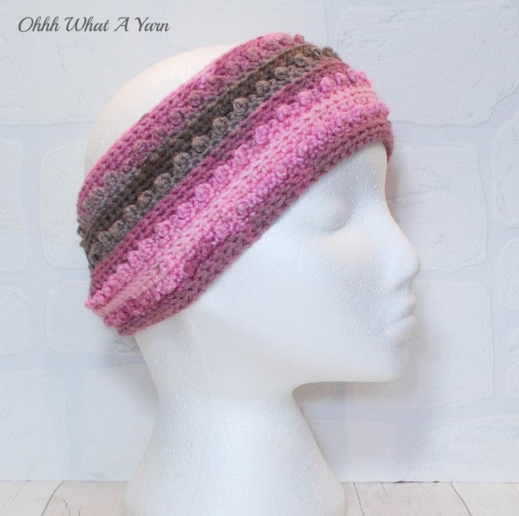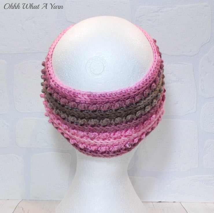 This pretty one size ladies ear warmer/headband has been crocheted using a gorgeous 100% acrylic colour changing yarn in shades of pink and brown.