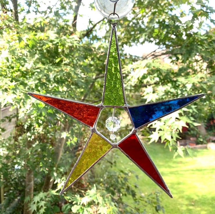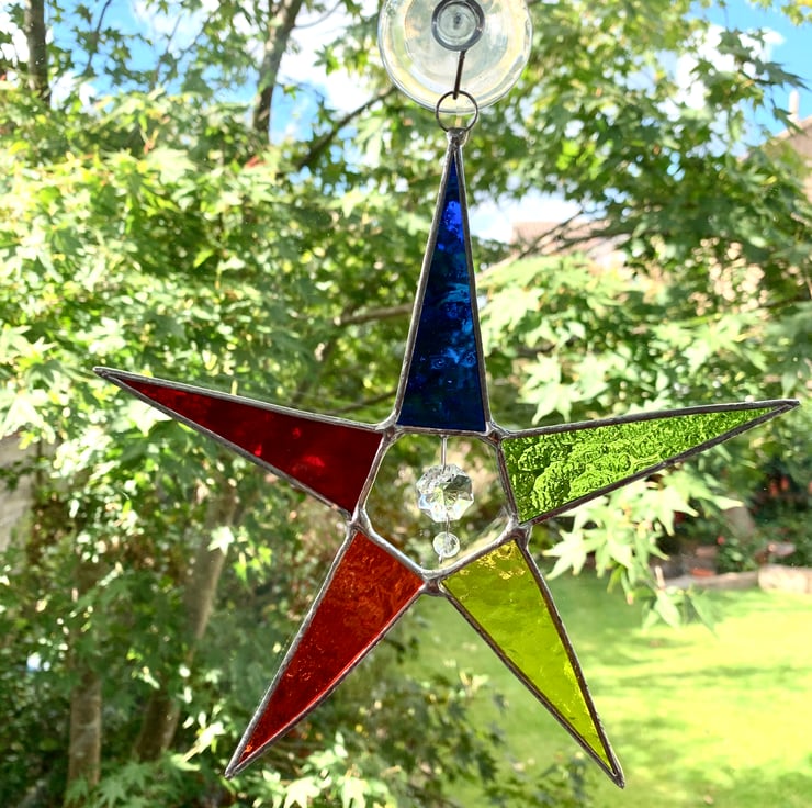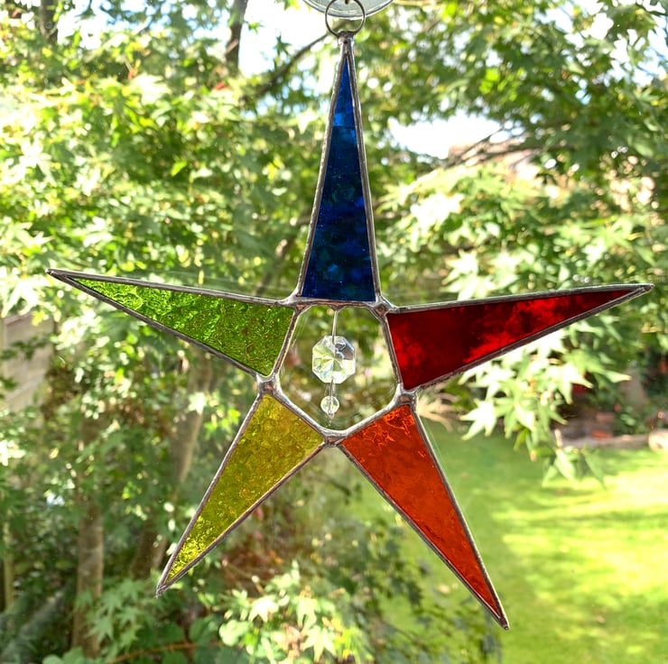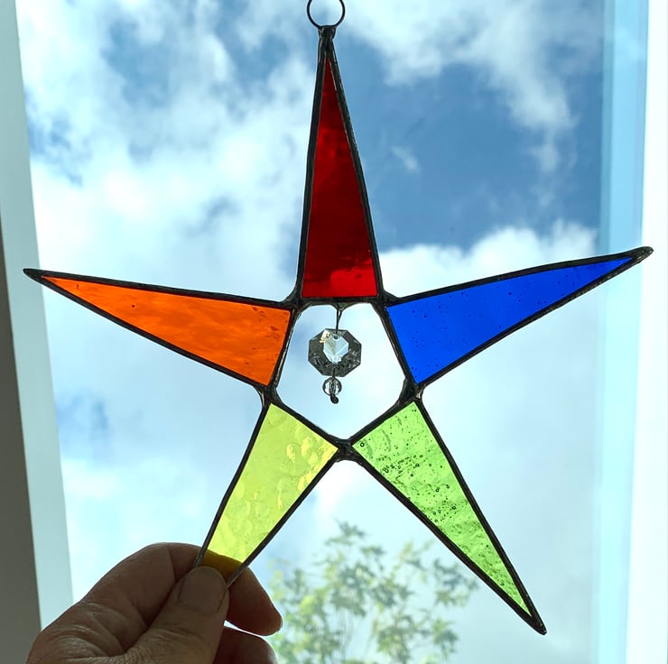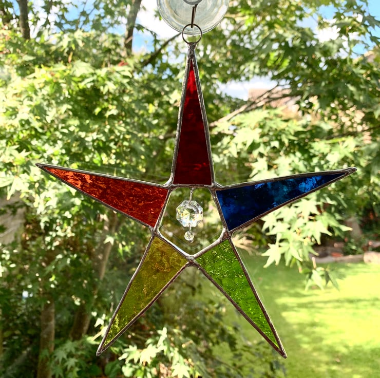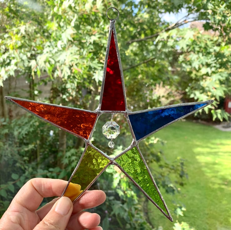 Each piece of glass has been hand cut, ground, washed, foiled and soldered together before being washed again and polished. A ring is attached for hanging purposes.
