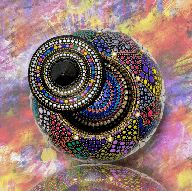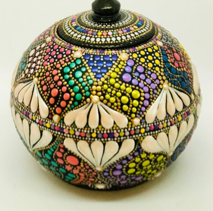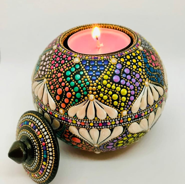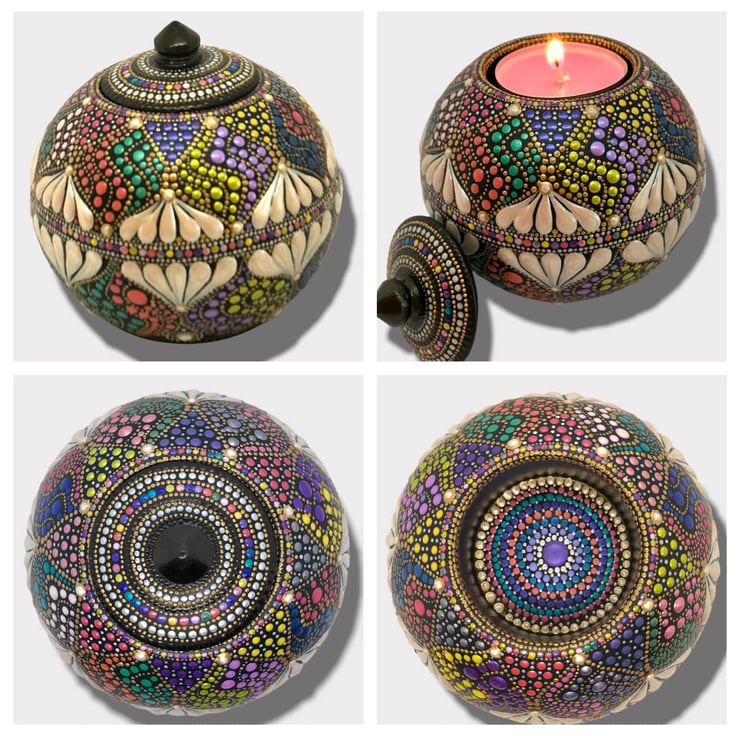 A spherical tea-light holder with matching lid, weighing about 575g and 8cm tall by 9cm wide. Cast from plaster and meticulously hand-painted in shimmery bright colours. Signed on the base with my .o signature, and sealed with 2 coats of satin varnish for a subtle sheen to protect from UV and dust. A small black pad, fixed to the base will protect any delicate surface that this is placed upon. As a precaution, I must add that it is probably not advisable to extinguish a live flame with the lid.