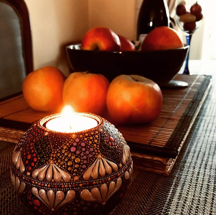 “All the colours” because the paints were all so pretty that I wanted to use them all :-) I applied the paint thickly and this makes the candle-pot beautiful to feel in your hands. The pattern is a favourite of mine, reflected above as below. The pearly “petals” encircling the pot were mixed with pearl and gold, which gives a more interesting warmer and natural feel than bright white pearl. When not accommodating a tea-light, you can also use the cavity for tiny treasures!