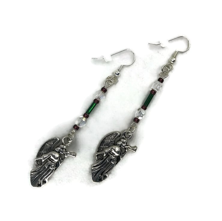 Christmas angel charms accented with green bugle beads, amethyst seed beads and vintage crystals suspended from silver plated fish hook earwires.