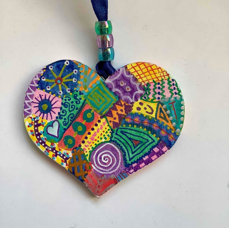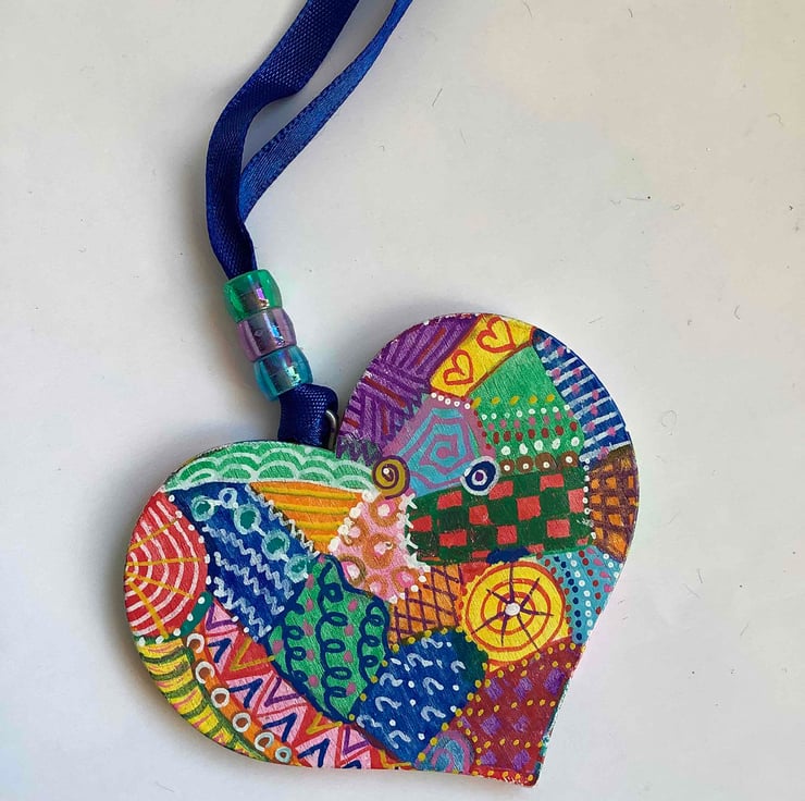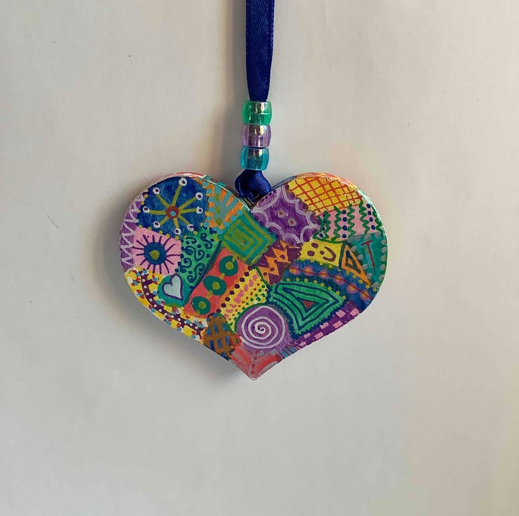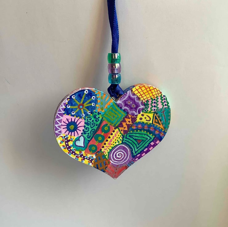 This wooden heart has been hand-painted and varnished. Lots of abstract designs cover both sides and around the edges.