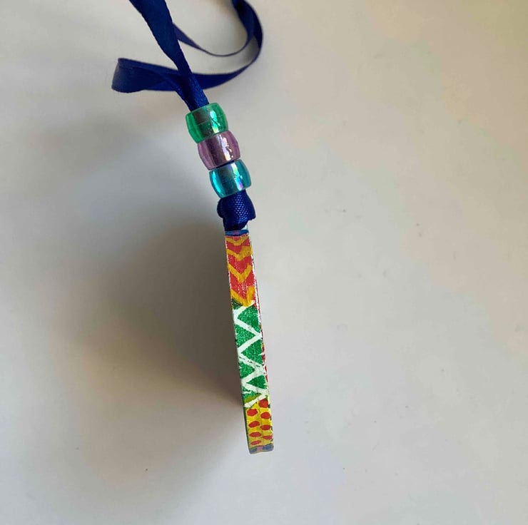 It hangs by a blue silk ribbon with 3 coloured beads.