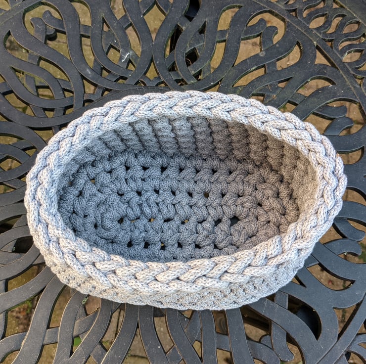A beautifully tactile oval crocheted basket in silver grey, made with a high quality recycled cotton braided cord which has a polyester core. The item is very sturdy and keeps its shape and the cord gives great definition to the crochet stitches used to create it.
