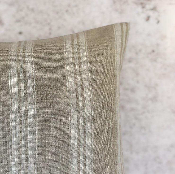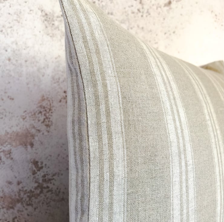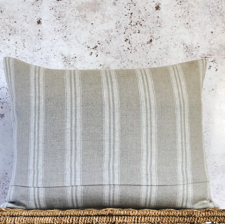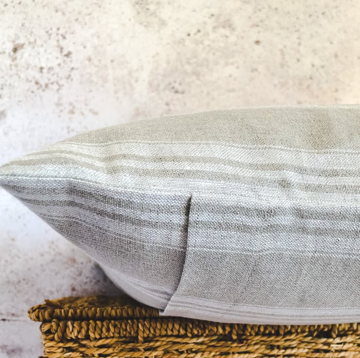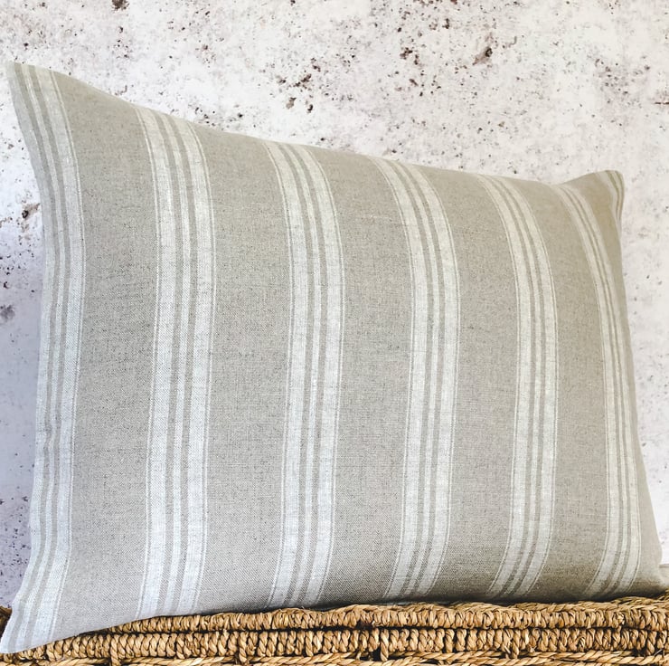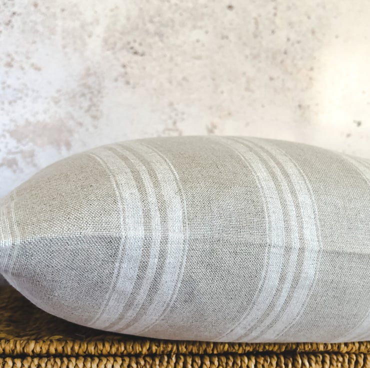Beige linen lumbar cushion cover, with off white stripes on a beige background. This washed linen cushion cover has a lovely modern country or farmhouse style look. It features classic stripes and a simple envelope closure.
