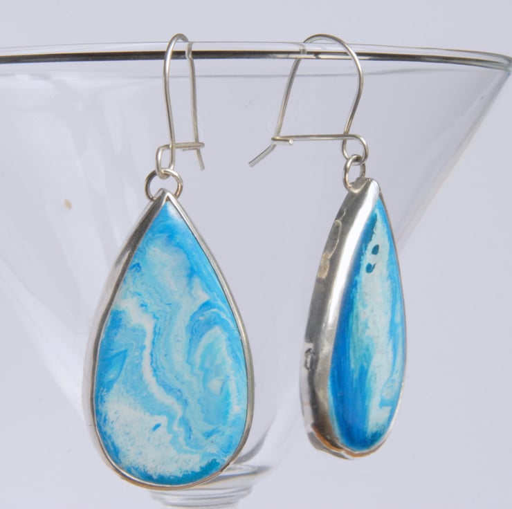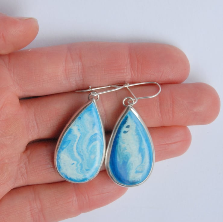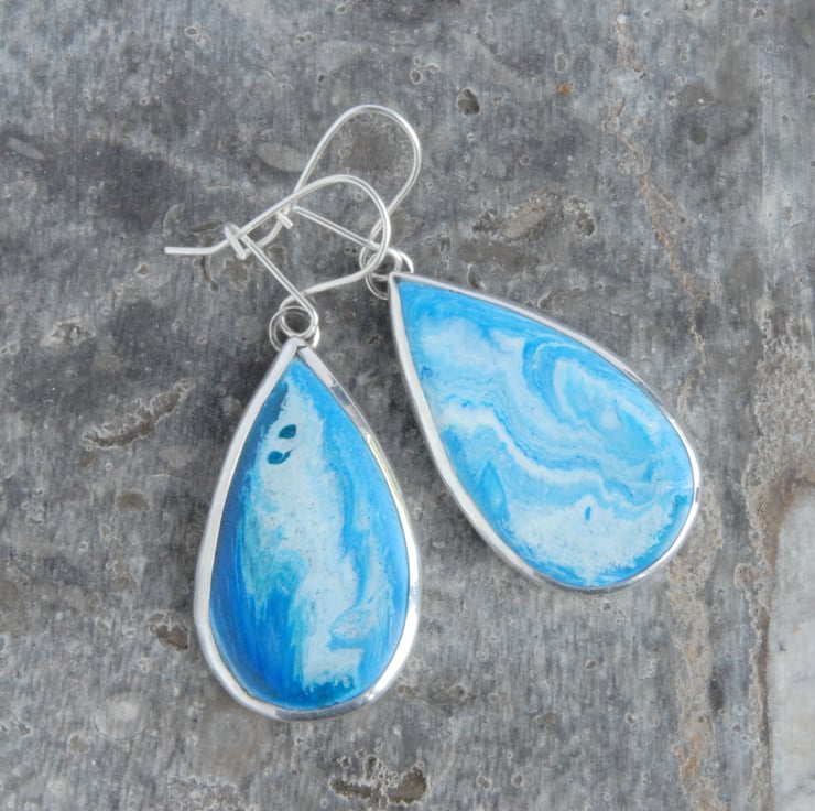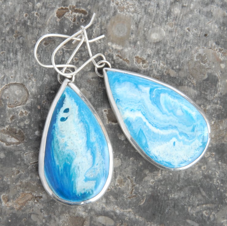 These oceanic inspired dangle earrings feature drops of Cornish surfite bezel set in sterling silver and finished off with sterling silver safety hooks (also know as kidney wires). I normally cut my surfite so it goes through the many different layers of resin but in this case the marbled blue and white layer reminded me of churning waves so I cut it within one layer, there are a few dimples in the layer but I didn't want to sand them out as I don't know how thick the layer is and doing that might have removed it. These dangly earrings measure 50mm (from top of the hook) by 15mm but surfite is lightweight so they are not heavy in the ears and the safety hooks mean they won't get lost in chunky scarves. Comes gift boxed.