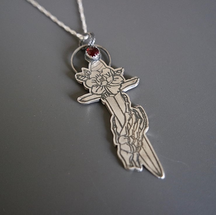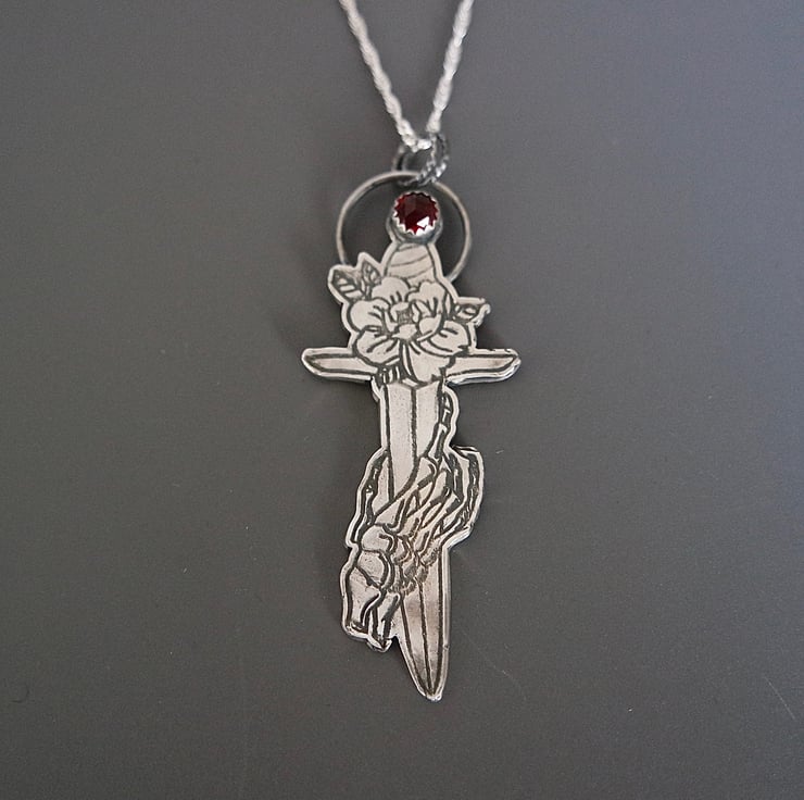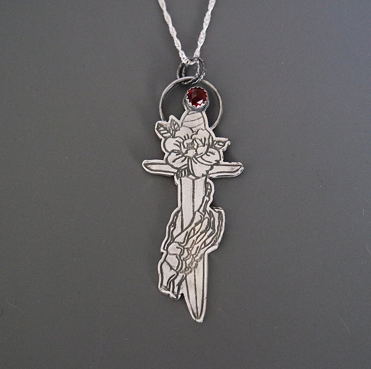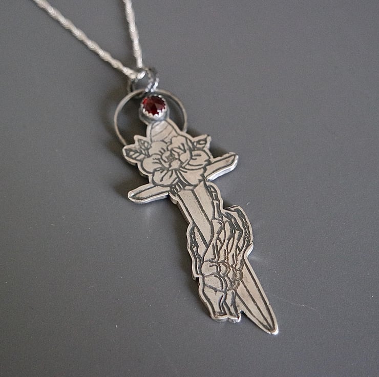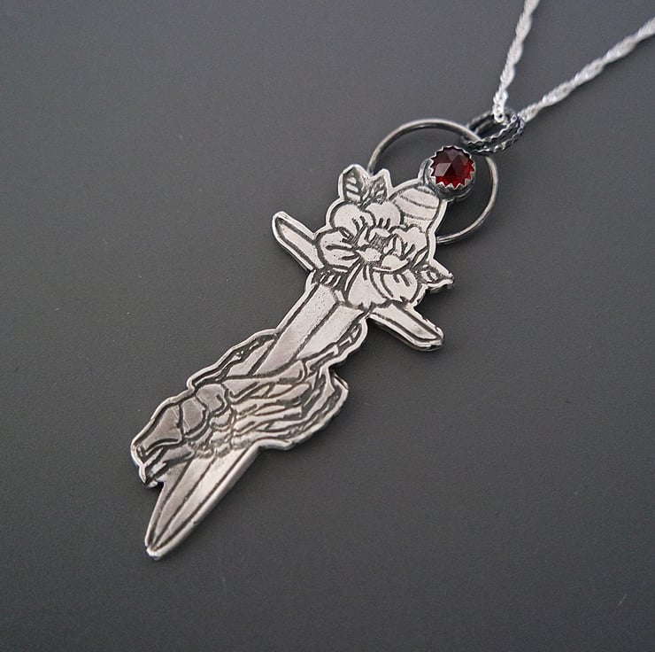 This gothic rose dagger with a skeleton hand and a red garnet stone is inspired by traditional tattoo designs and stands for duality.