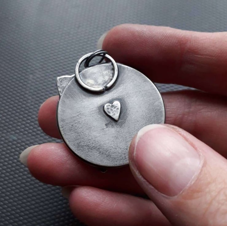 This is a lot of meaning packed into a silver pendant just as there are a lot of silver smithing techniques and different materials of sterling silver and fine silver combined in this piece.