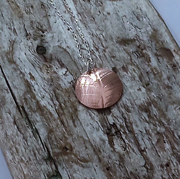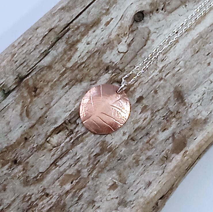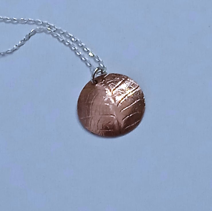 I have created this beautiful pendant from copper sheet to which I have applied a skeleton leaf imprint design to create an attractive organic texture, I have hand sawed the disc shape and given it a domed shape before polishing.