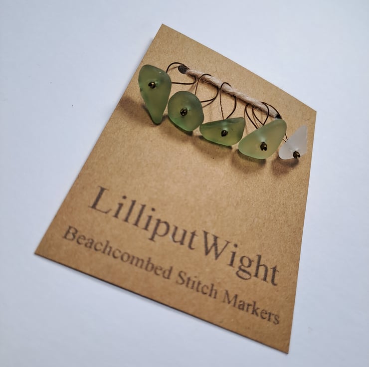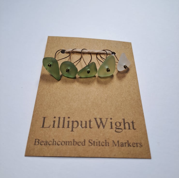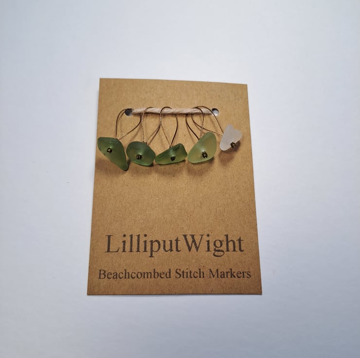 A set of five sea glass stitch markers in shades of green and frosted clear glass. The sea glass is all genuine and has been collected from beaches close to my home on the Isle of Wight.