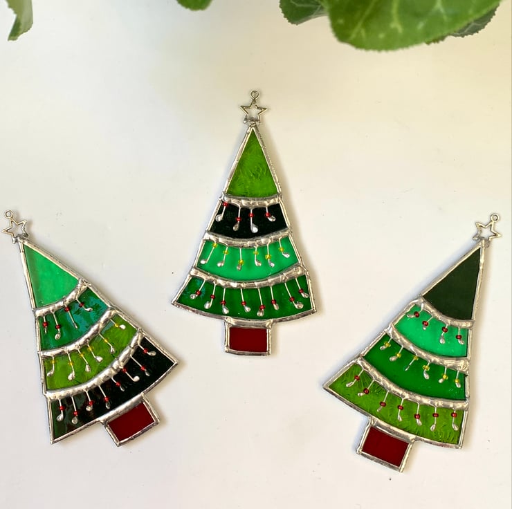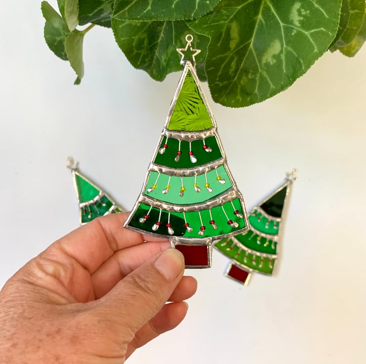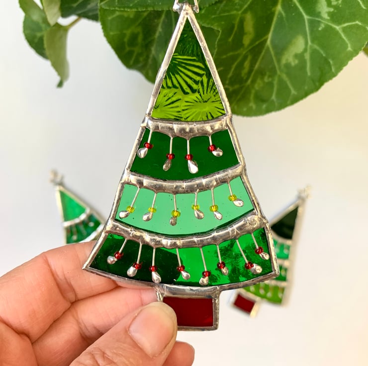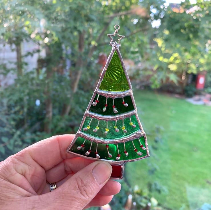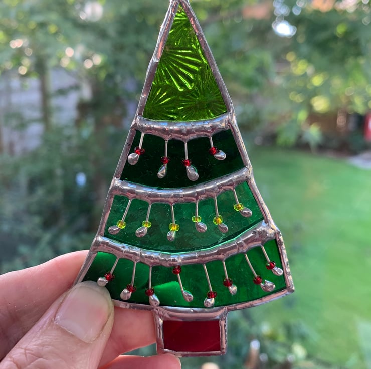 I will make it using 4 different types of green stained glass for the tree and a lovely red sea glass for the stand. The 18 baubles have been made by threading a small bead onto fine tinned wire. A silver plated star has been attached.
