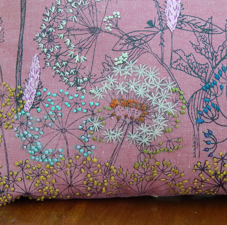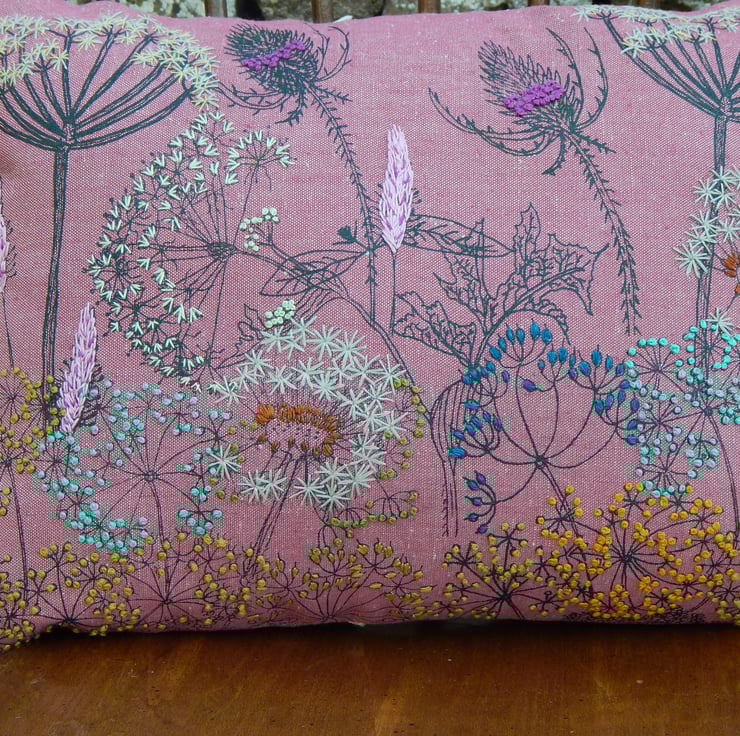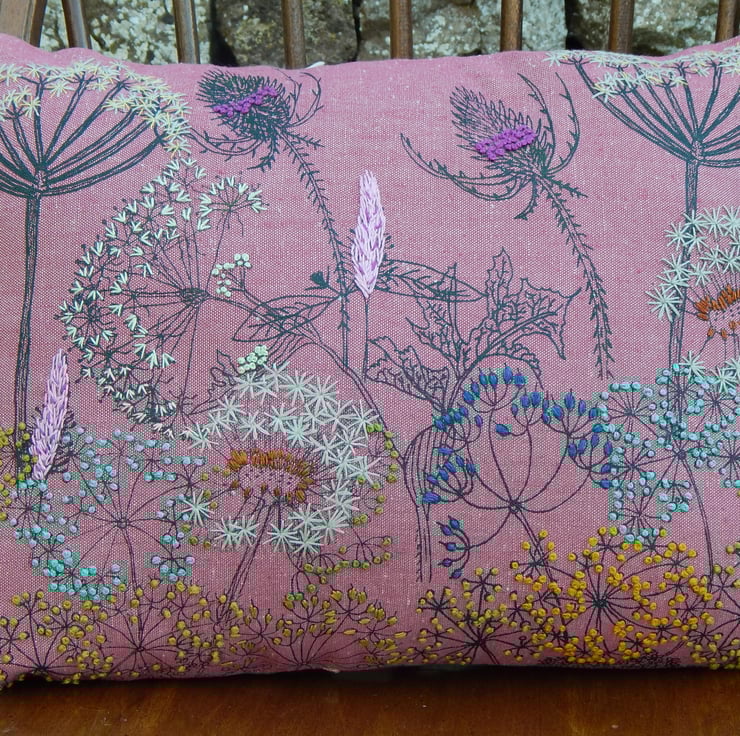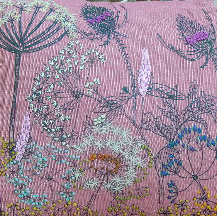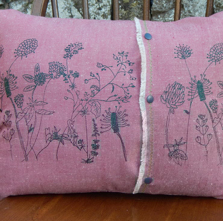 This is a pink medium weight cotton/linen cushion that has been screen printed with my own designs. Many have been individually printed which involves positioning, printing an individual flower, drying and then repeating. This gives you an absolutely one off, designed cushion. Many of the flowers are then hand embroidered to lift the petals from the fabric and give a pop of life and colour. These include clover, dock leaf and cow parsley, teasel and dandelion clock.