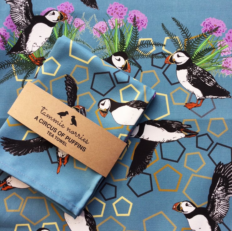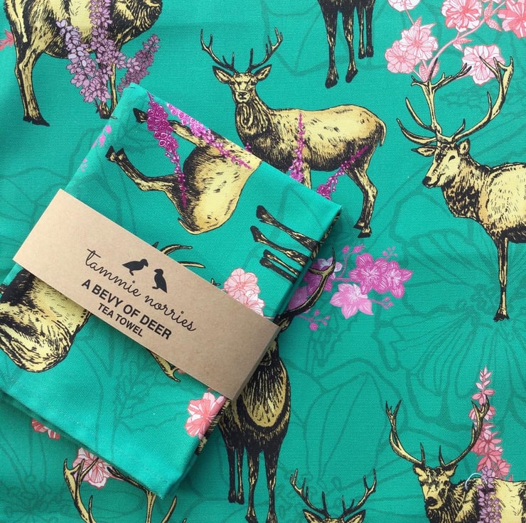 I trained in Applied Arts and printmaking and in 2018 won Kirstie’s Handmade Christmas toy competition. I set up my company, Tammie Norries, I during the first lockdown in March 2020. I work from my home studio in Inverclyde in Scotland. My tea towels, greetings cards and gifts are bold, bright and colourful and are all based on Scottish wildlife featuring animals and flowers. I hope they will bring warmth and colour into your home.