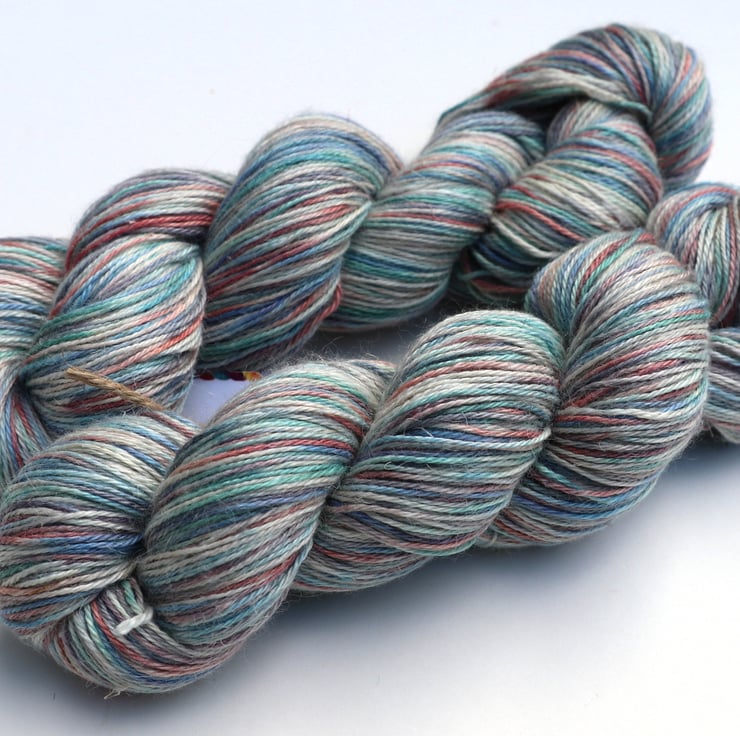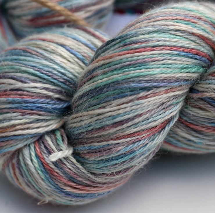 Off-white (undyed) with splashes of peach, light blue, light green and lavender. This baby alpaca, silk and linen blend 4-ply weight yarn is being offered as a special at a reduced price because I ordered a small quantity but decided not to add it to my yarn range. This yarn is lustrous and like my baby alpaca/silk blend, has a smooth feel, but the addition of linen makes it slightly thicker in appearance and cool linen feel. It is luxurious and drapey, making it a wonderful choice for light shawls, for example. There are two skeins available, price shown is for one. Photographs have been taken and edited in bright natural light.