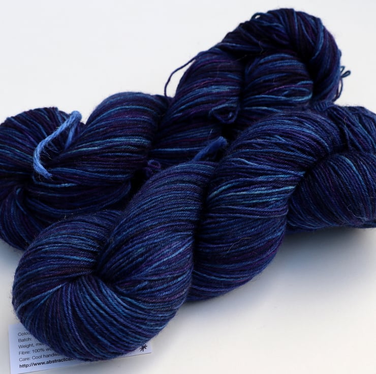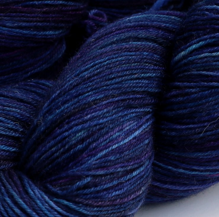 Dark blues with hints of purple and dark teal and some lighter sections. This Bluefaced Leicester superwash yarn is soft with a very slight lustre. Please note that this is a different superwash BFL base to my usual base, and is being offered at a special price because I decided to stick with my usual base. There are two skeins available (price shown is for one). They have been dyed together but have some differences in colour proportions and blending so if you plan to use both in the same project, alternating skeins as you work is recommended. Photos taken and edited in bright natural light.