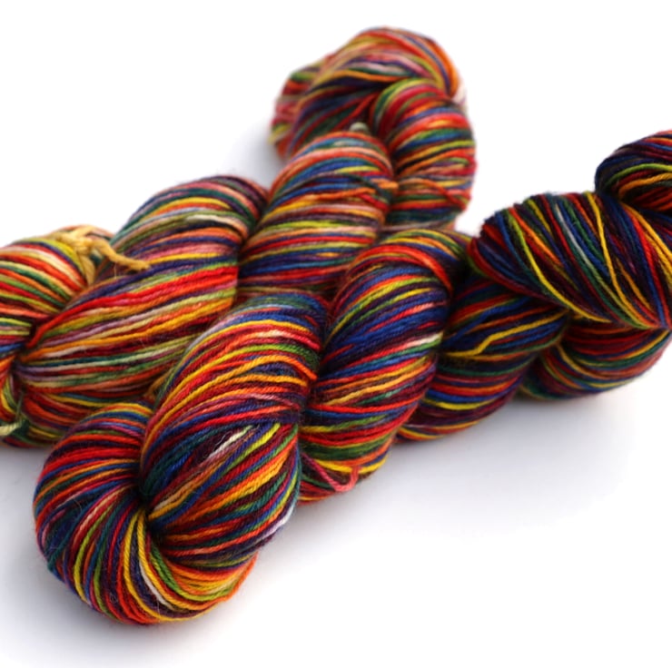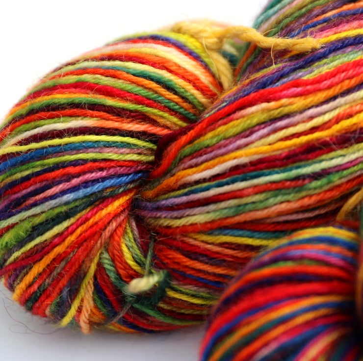 Very randomly dyed using yellow, blue and red dyes, this yarn has a wide spectrum of colours - a little bit of everything! This Bluefaced Leicester superwash yarn is soft with a very slight lustre. There is one skein left and it is the lighter, more yellow/green skein (first photo and back of second photo), Photos taken and edited in bright natural light.