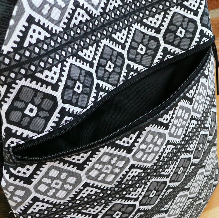 This backpack is made from a wet look black vinyl on the back and side gusset and a grey, white and black cotton fabric on the front. This bag features a chunky zip top closure, a large zip pocket on the front, polypropylene webbing straps and a carry loop. Inside the bag is fully lined in cotton cotton canvas and has a slip pocket and a zip pocket. All bag hardware is in silver nickel