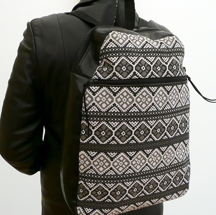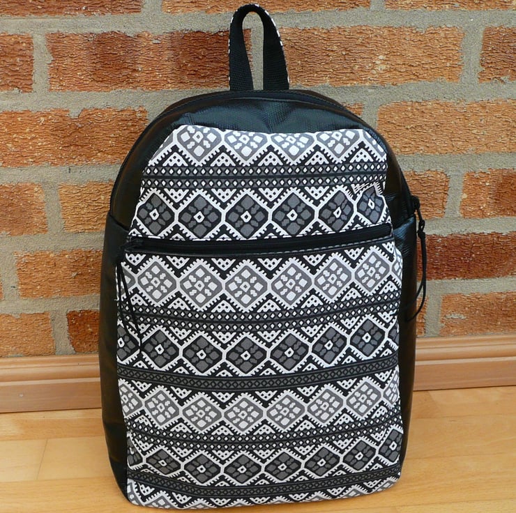 Black vinyl backpack with grey, black & white feature front panel and zip pocket