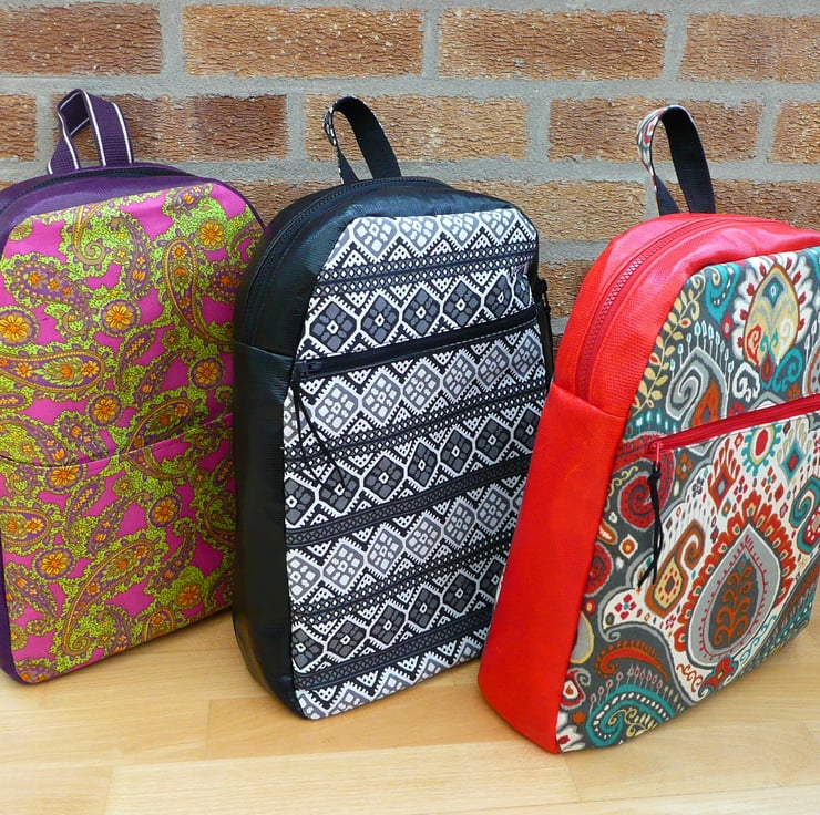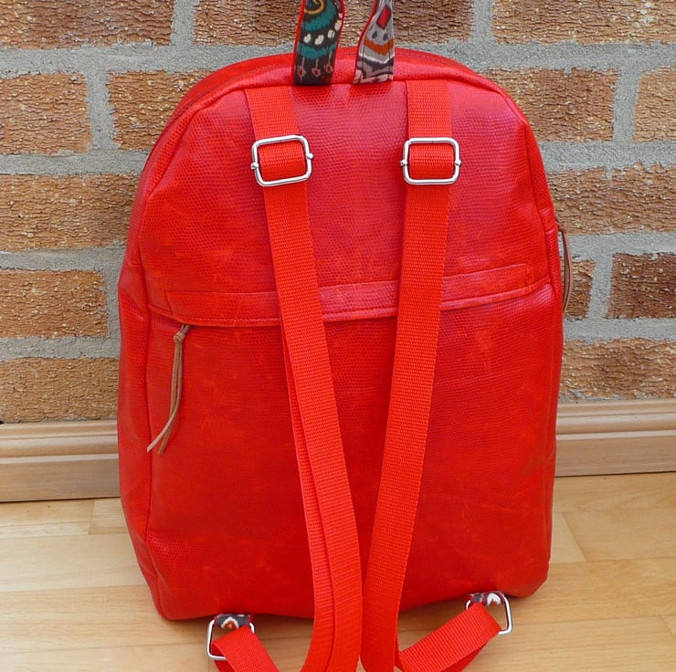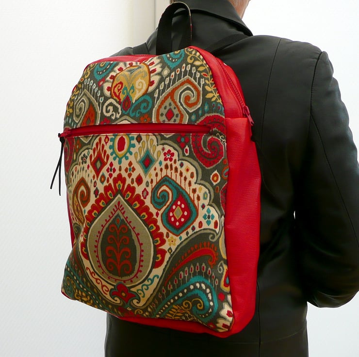 This backpack is made from a large paisley pattern fabric in red, teal, grey cream on the front and red vinyl on the back, side gusset and bag base. This bag features a chunky zip top closure and a slip pocket on the front. The straps and carry loop are 1" wide red polypropylene webbing. Inside the bag is fully lined in red cotton canvas and has a slip pocket and a zip pocket. All bag hardware is in silver nickel