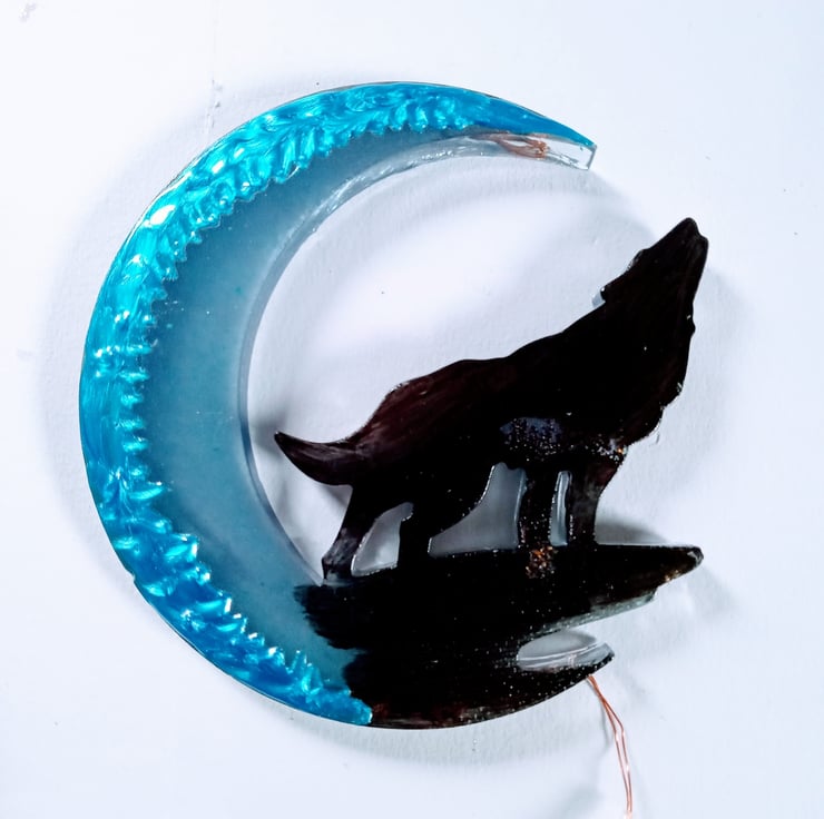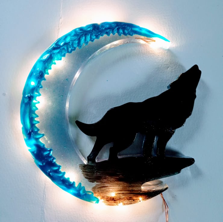 Wolf moon wall hanging light made from resin and hand painted
