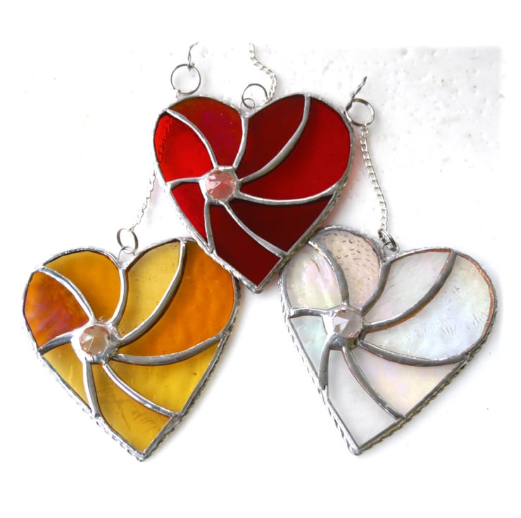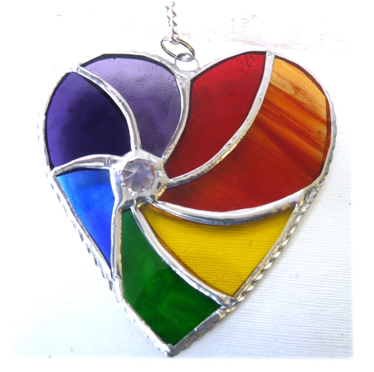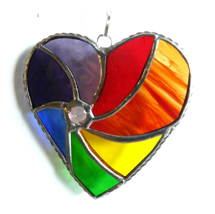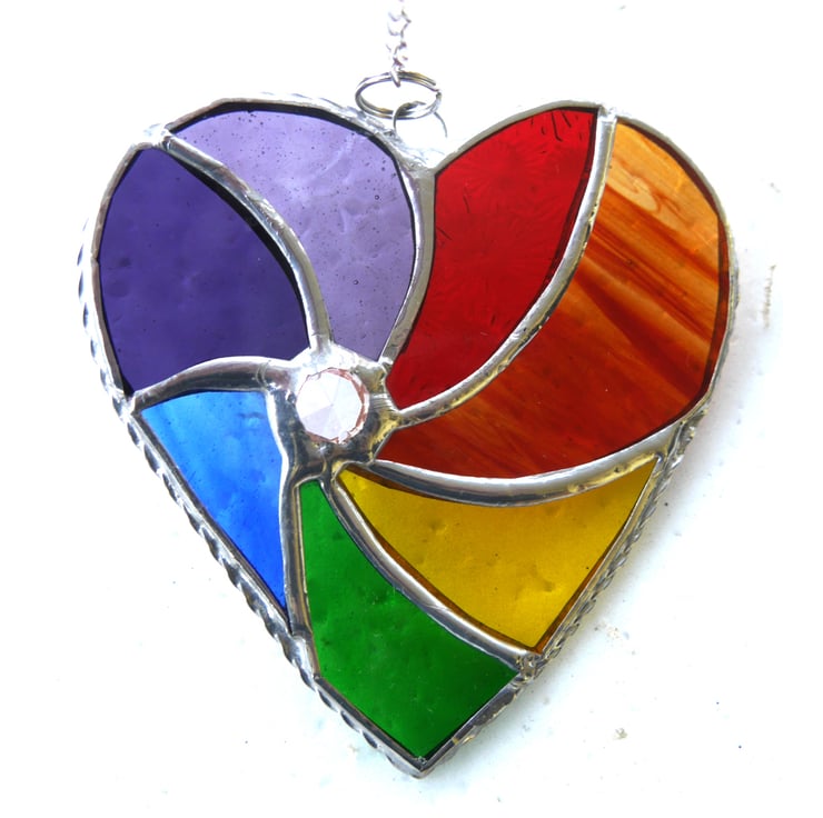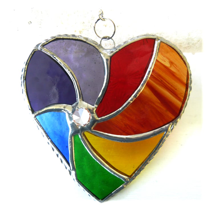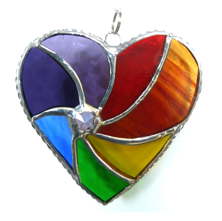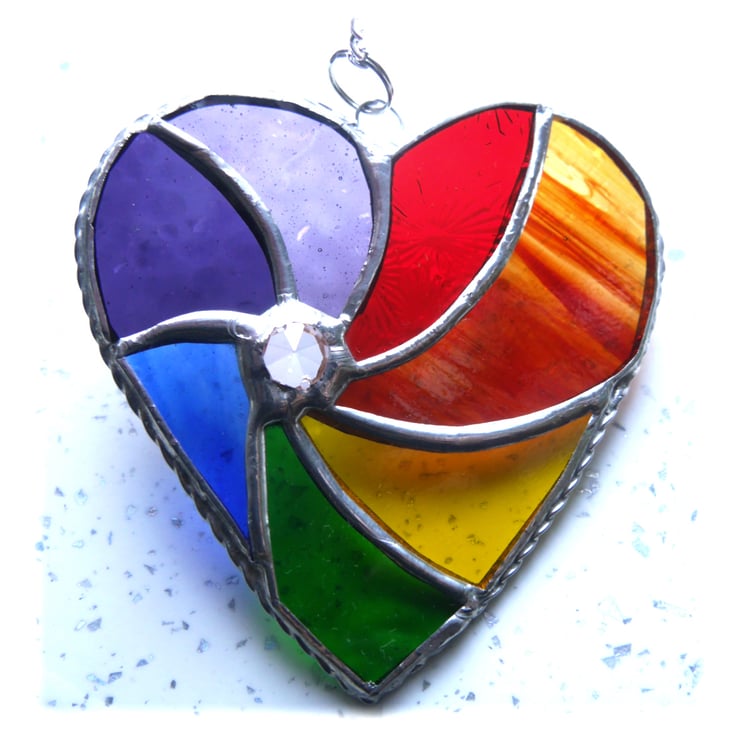 I've made the heart from 7 types and colours of glass, all the colours of the rainbow and I've set them in a swirl round a sparkling crystal.