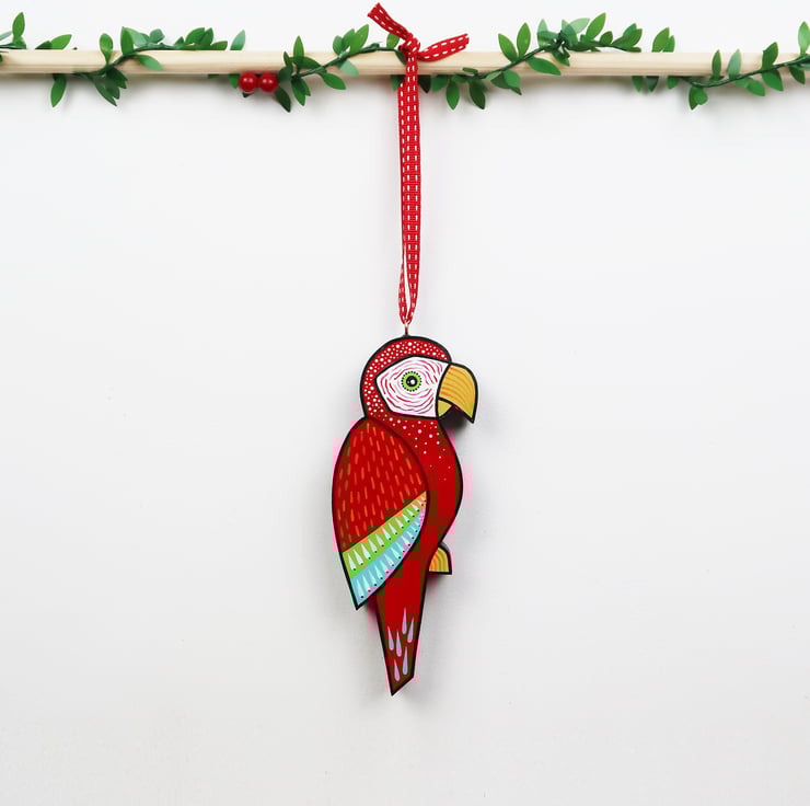 Red Parrot hanging decoration, Scarlet Macaw Christmas tree ornament.