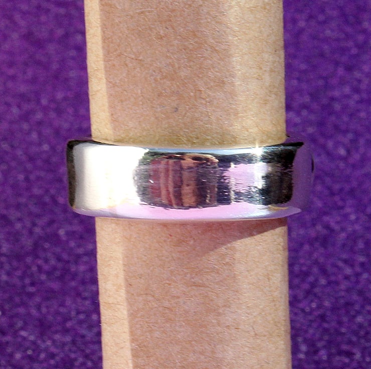 The ring is size T (UK). She weighs 14gm. The band is 7.5mm wide and 2.5mm thick (quite thick !). It was made, by myself, from finest Sterling silver.