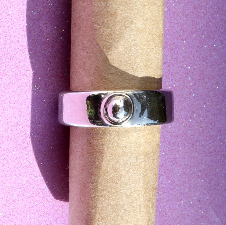 A beautiful and timeless style is given with this designer ring. A pearl of silver, framed and placed on a serious band of silver. Certainly a noticeable piece of jewellery !.