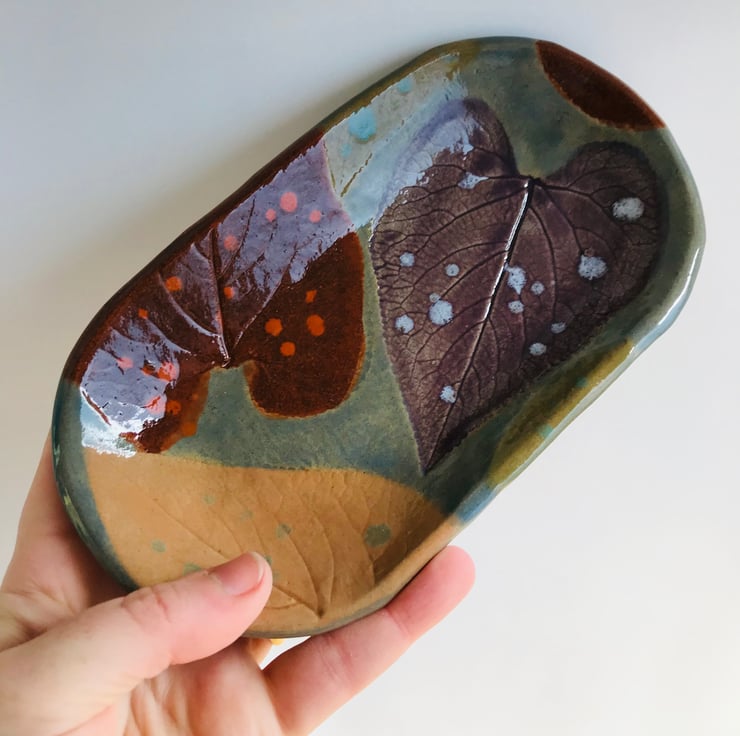 Small oval bowls made from printing real leaves and then hand forming into a dish shape. Made from stoneware they are frost, oven and microwave proof. Hand painted in rich purple and blue glazes. Shapes sizes and colours may vary slightly from those shown due to the organic making technique.