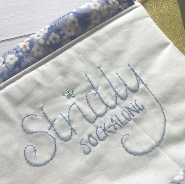 'Strictly Sock-Along' is hand stitched using DMC embroidery threads and the 'i' is embellished with a sparkly star sequin (Fab-u-lous, darling!)